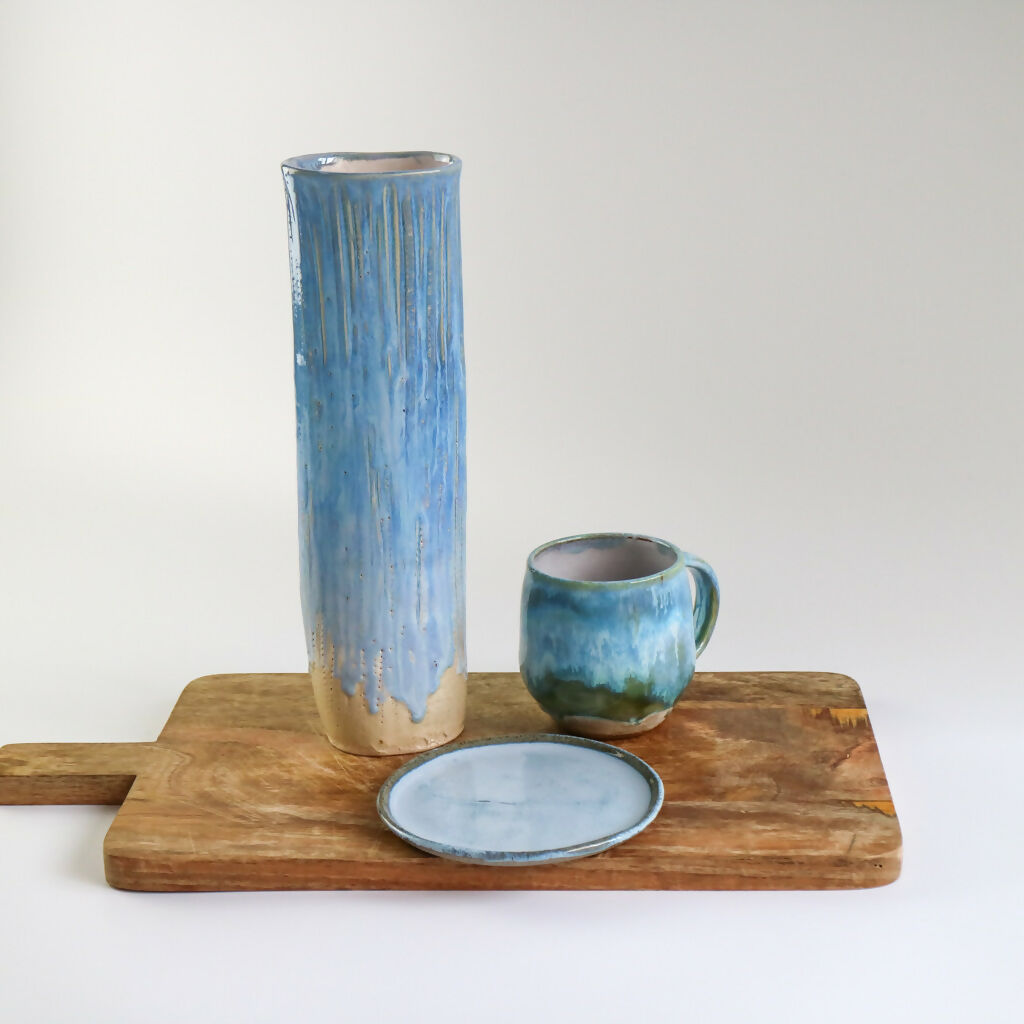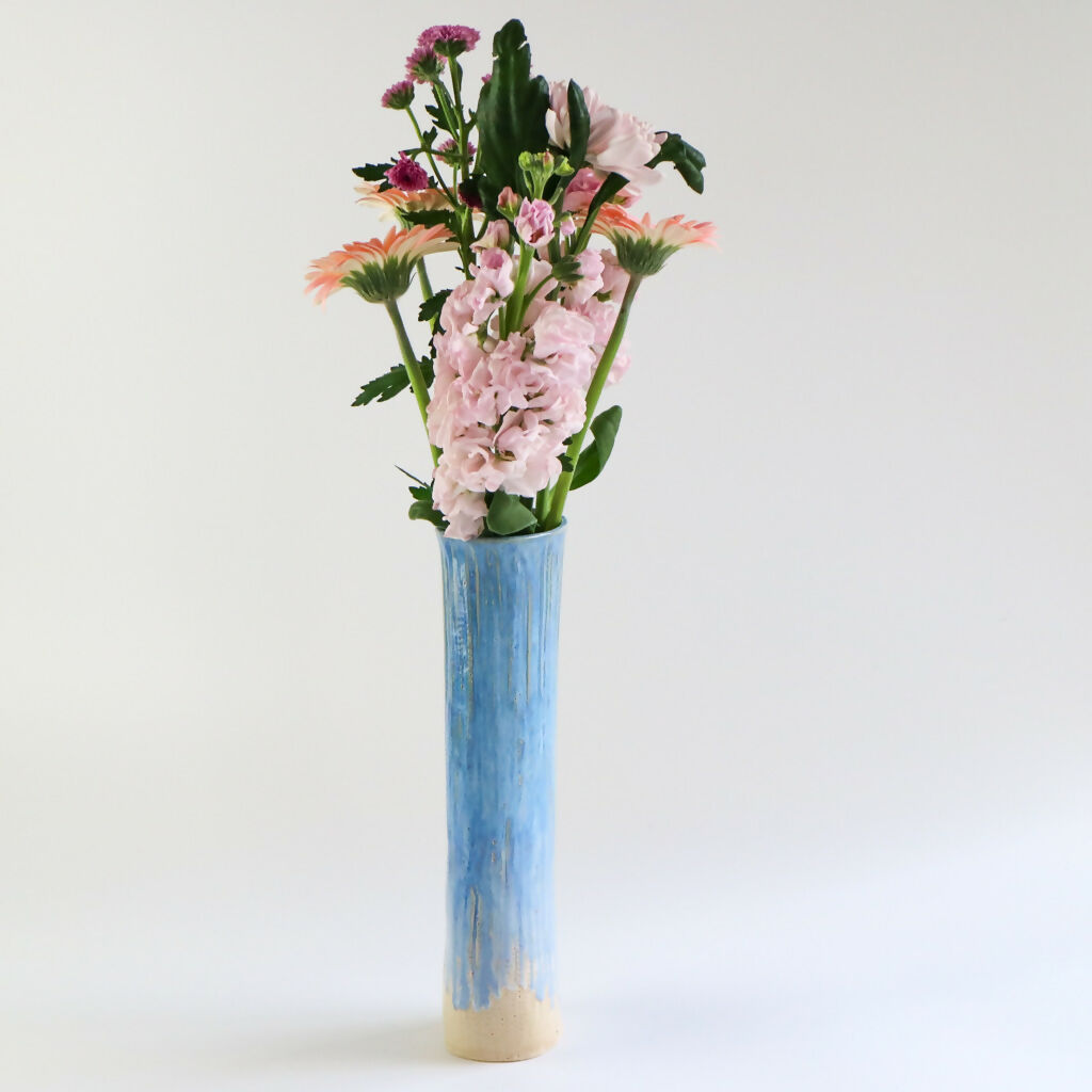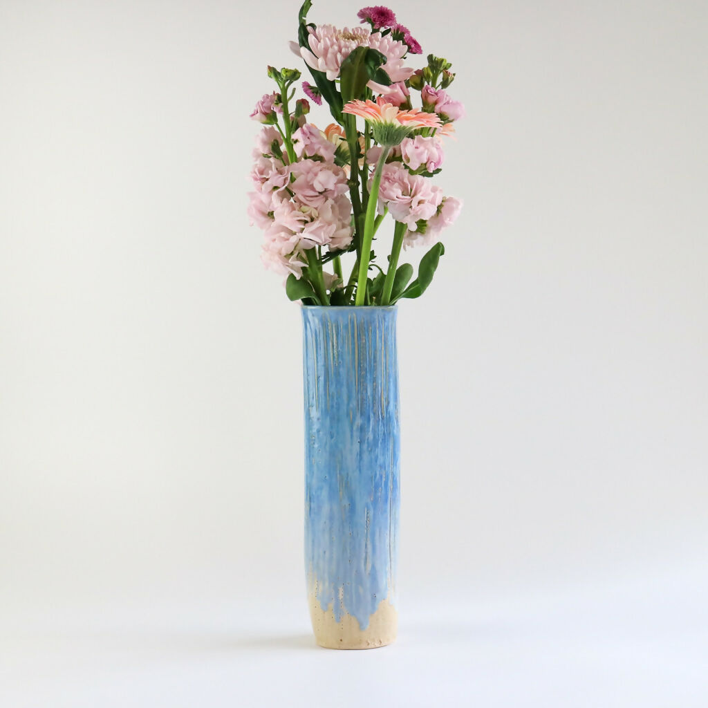 Inspired by the calming tones of the sea this handmade stoneware vase has been decorated with a rich surf blue glaze that flows and pools organically over the textured surface.
