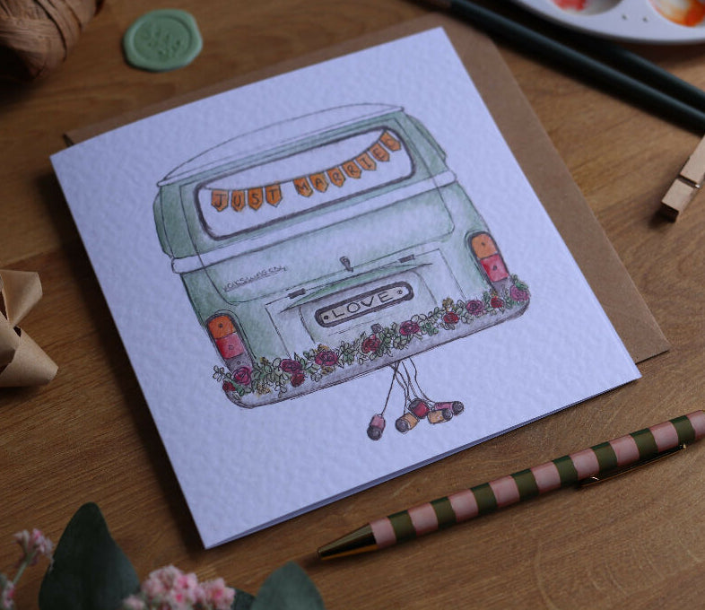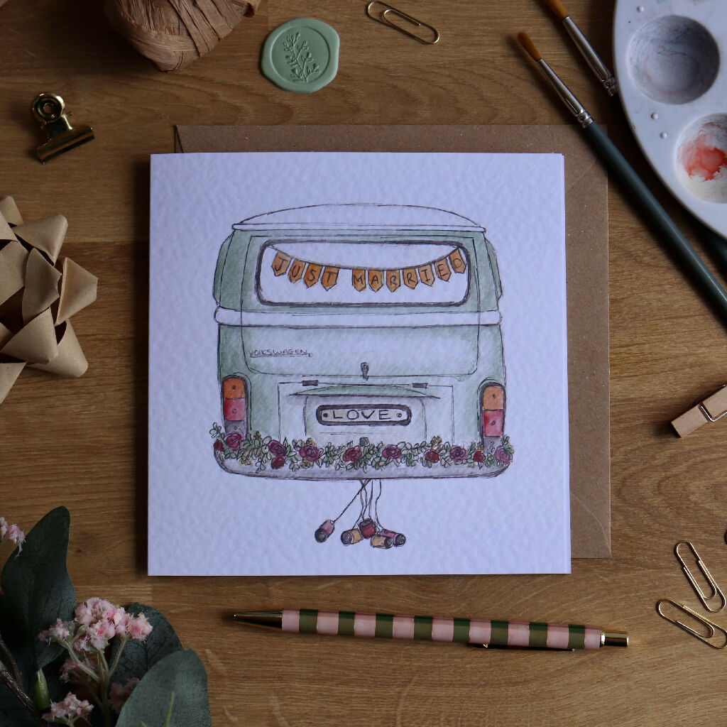 Featuring a watercolour illustration of a camper van with wedding flowers and just married banner. Why not create the perfect gift and pair it with a matching keyring or coaster.