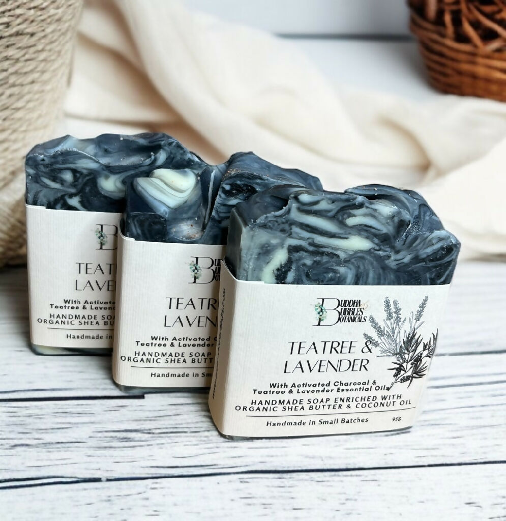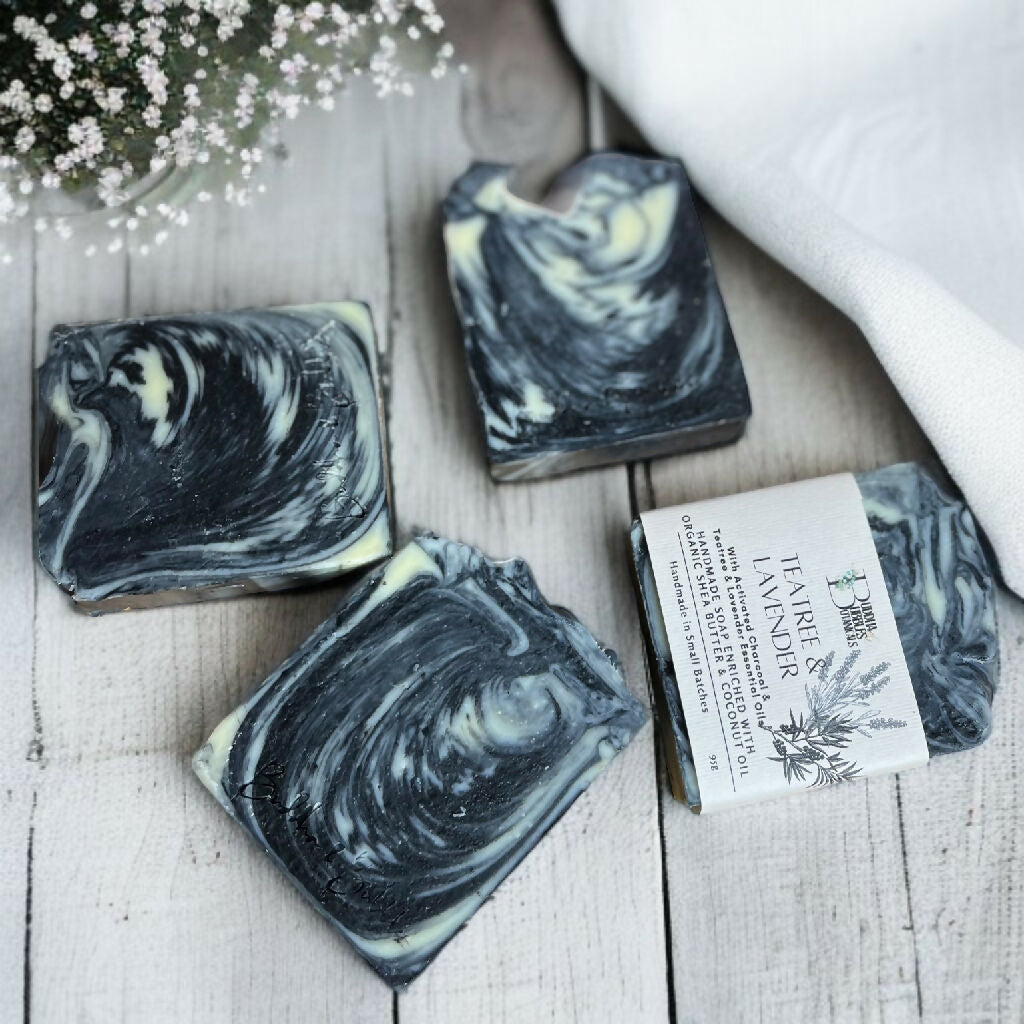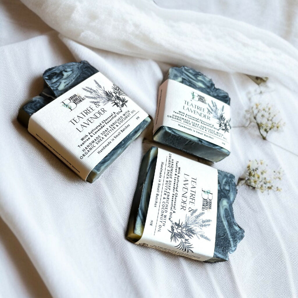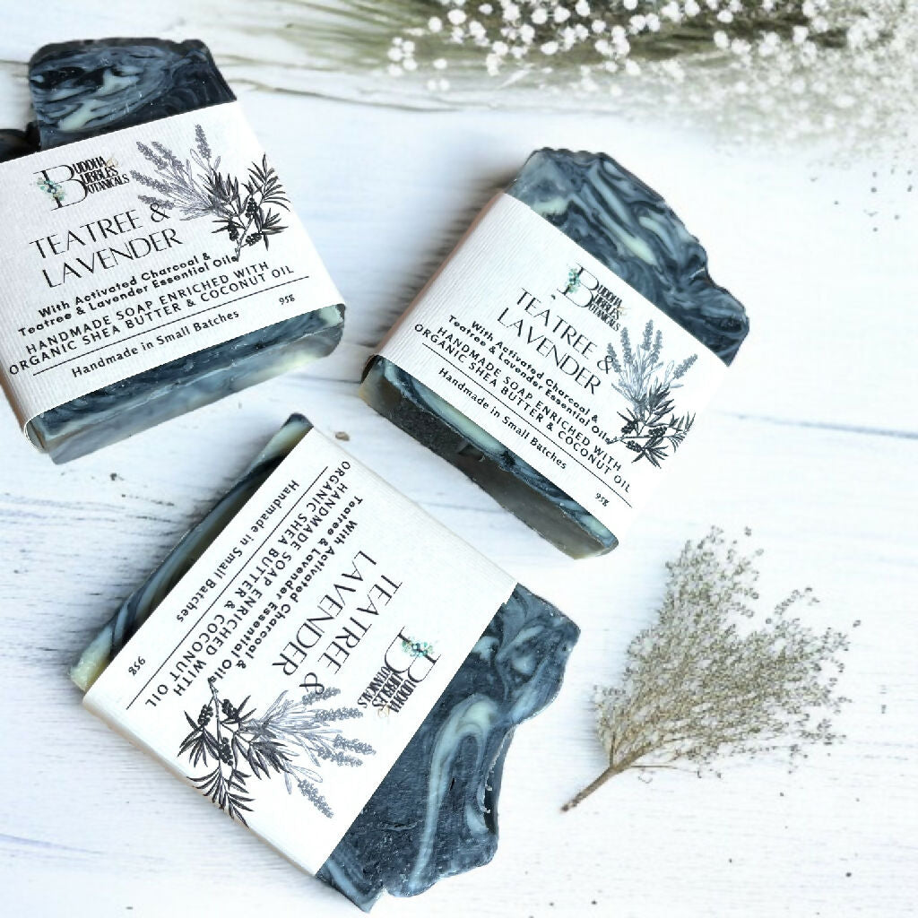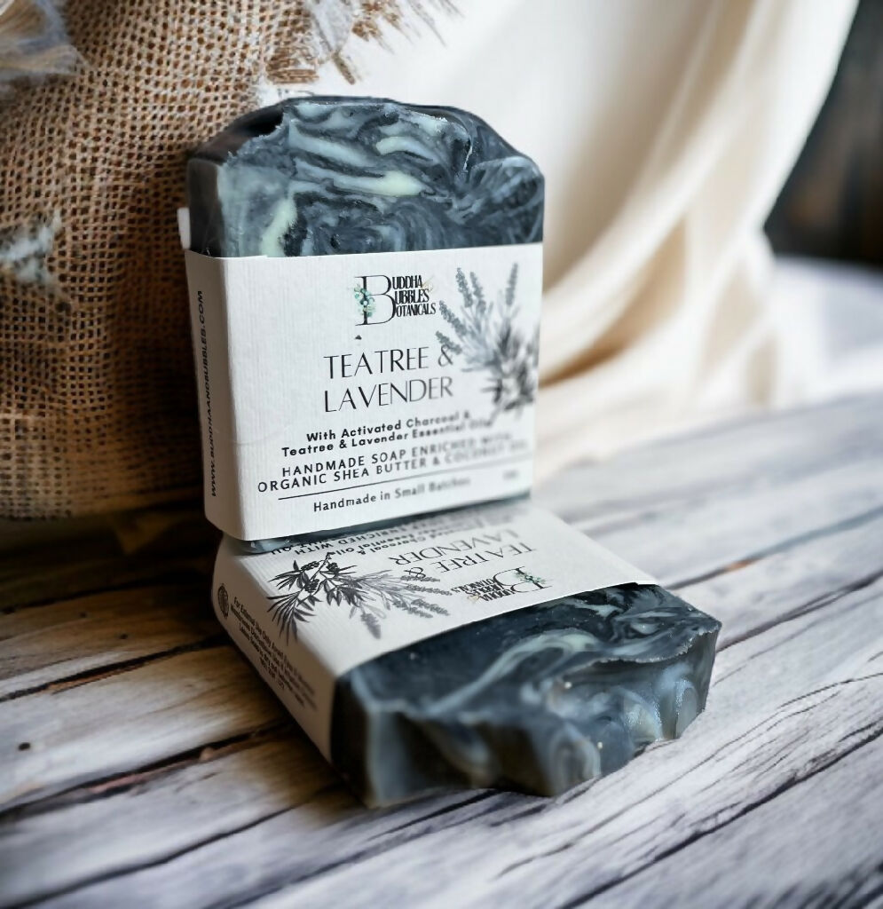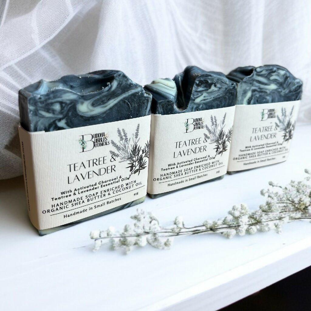 Our soap features a perfectly balanced blend of Tea Tree and Lavender Essential Oils, chosen for their complementary therapeutic benefits: