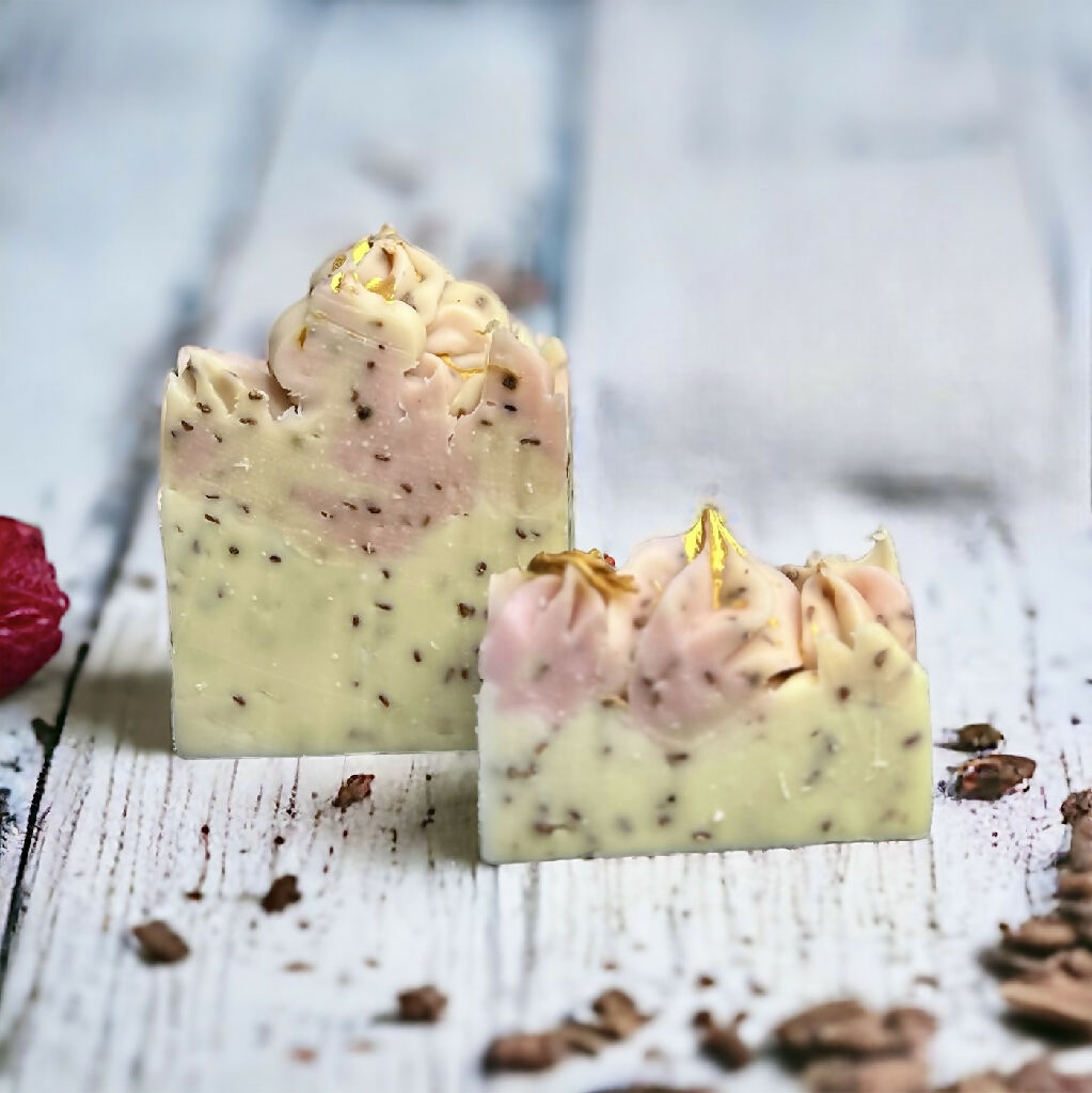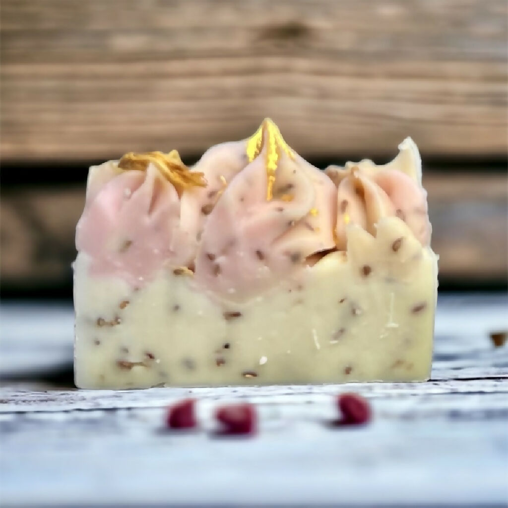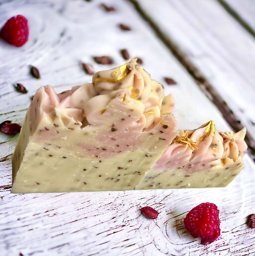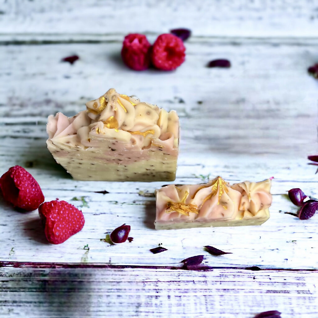 We transform waste into wellness by using Upcycled Raspberry Seeds. After being pressed for their oils in the food industry, these nutrient-rich seeds are repurposed into our soap. They provide a beautifully gentle exfoliation, helping to buff away dead skin cells for a smoother surface, all while promoting sustainability and reducing waste.