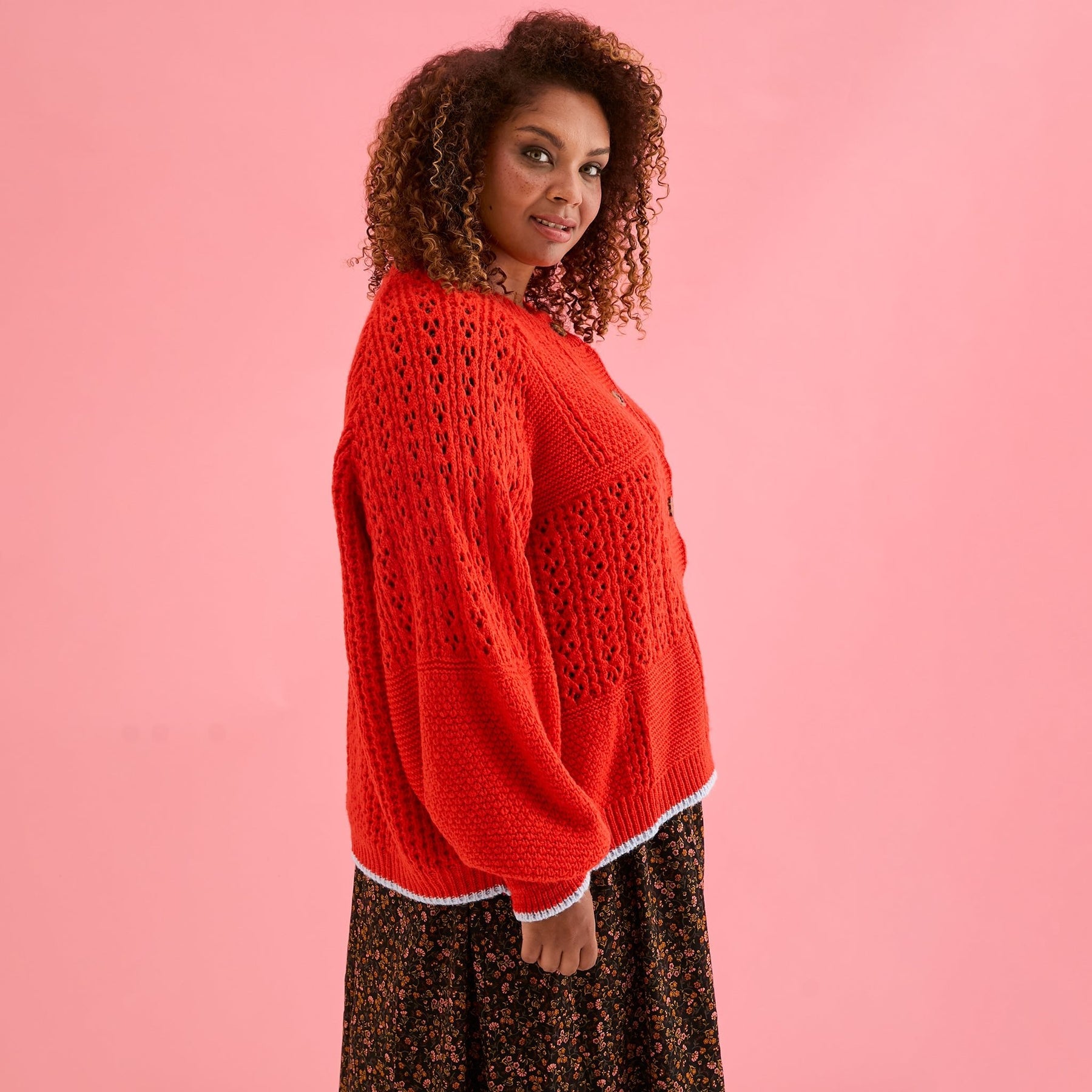 Bring the sunshine wherever you go with Brigit — a playful, standout cardigan designed to energise your wardrobe. With its bold orange hue, soft blue contrast tipping and statement balloon sleeves, this textured knit is cut in our signature relaxed, oversized fit for ultimate comfort and impact.