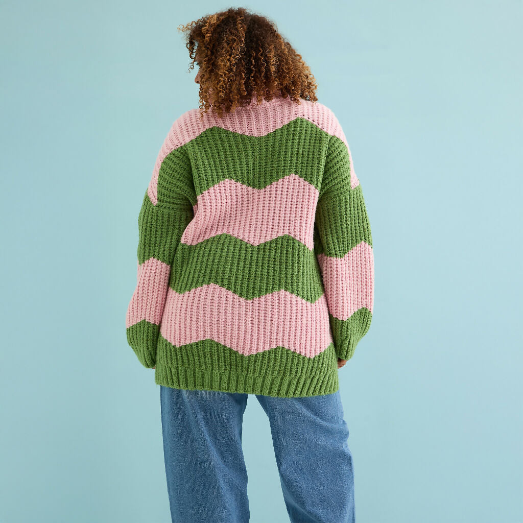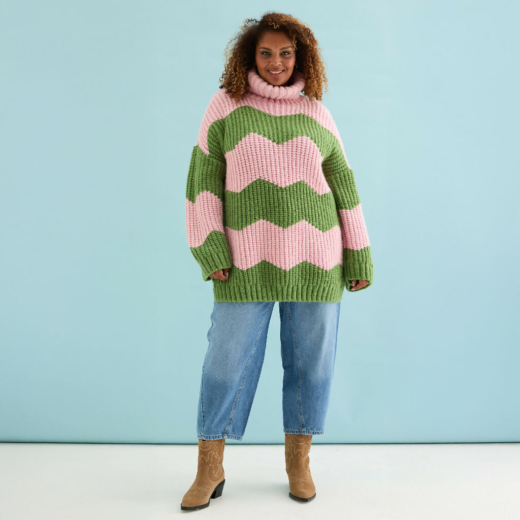 Nelly is your showstopper 💚💖 Designed by Cara in bold zigzag stripes of green and pink, she’s a knit dress with a mock turtleneck, a slouchy relaxed fit and all the comfort of y...