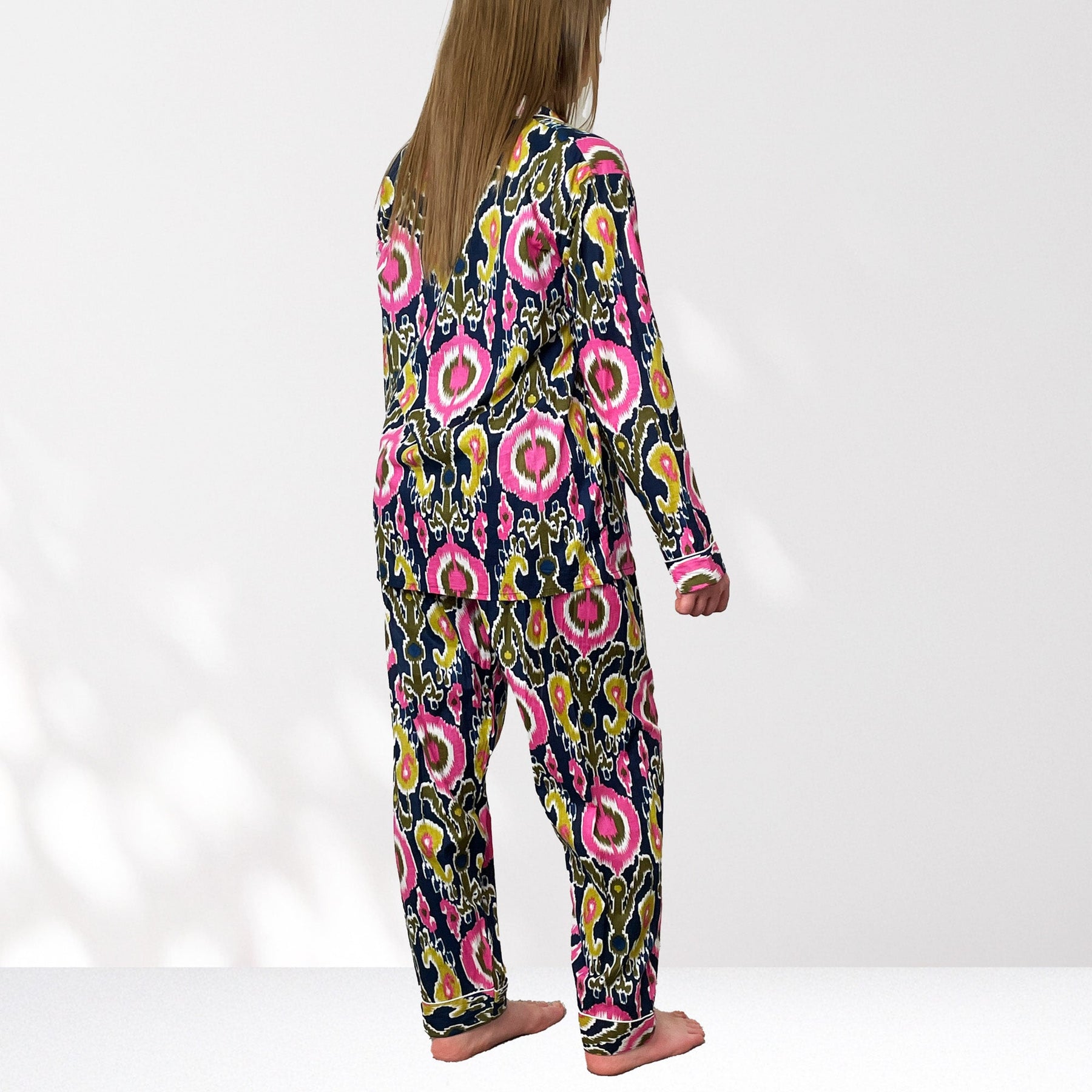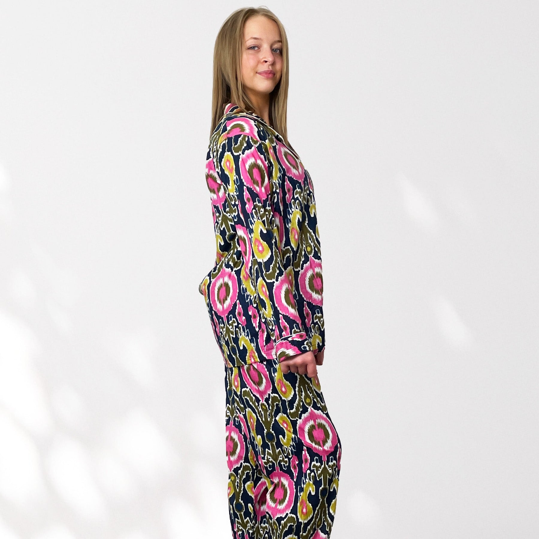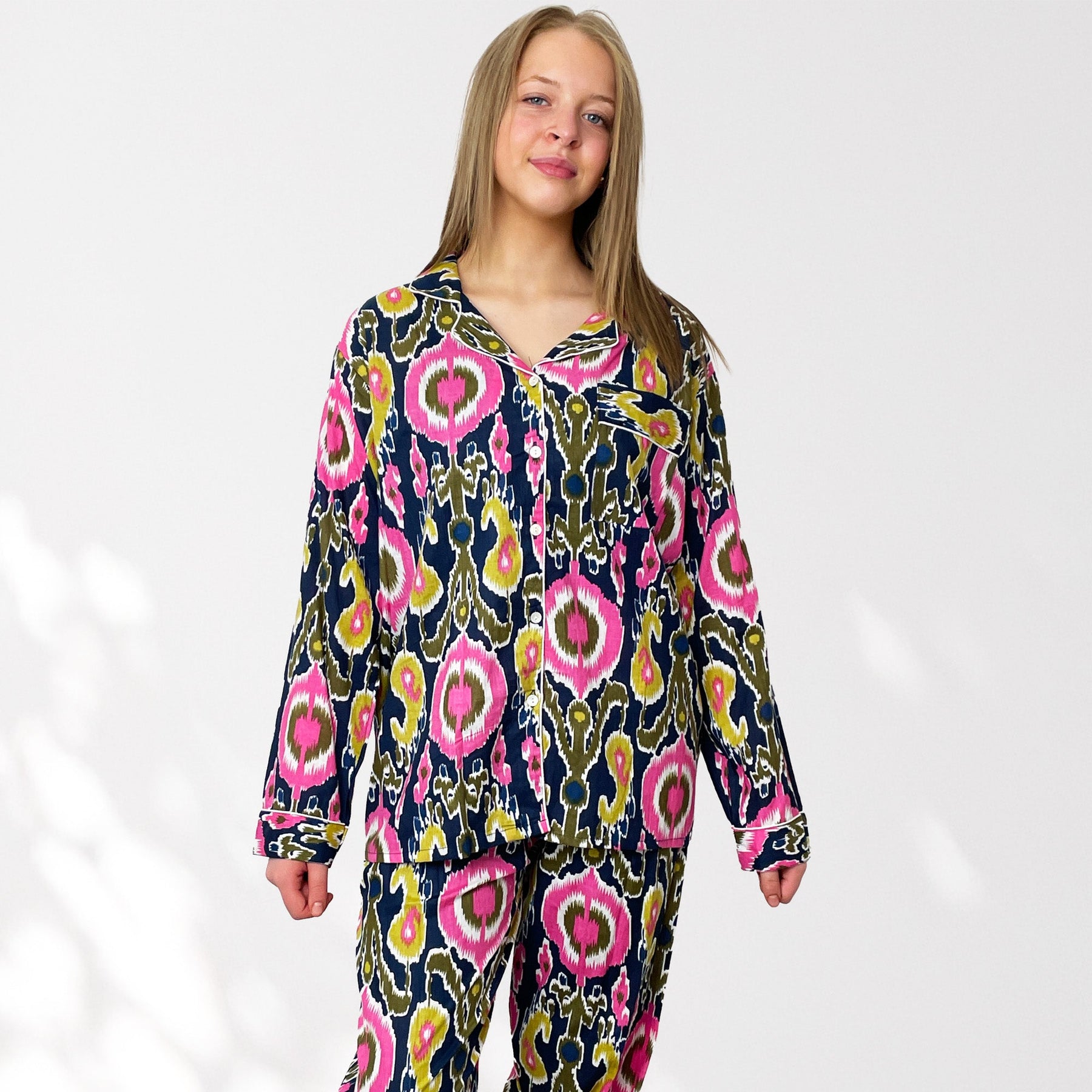 Indulge in our exquisite 100% Cotton Pyjama Set featuring striking ikat tribal style prints on a Navy Blue background.