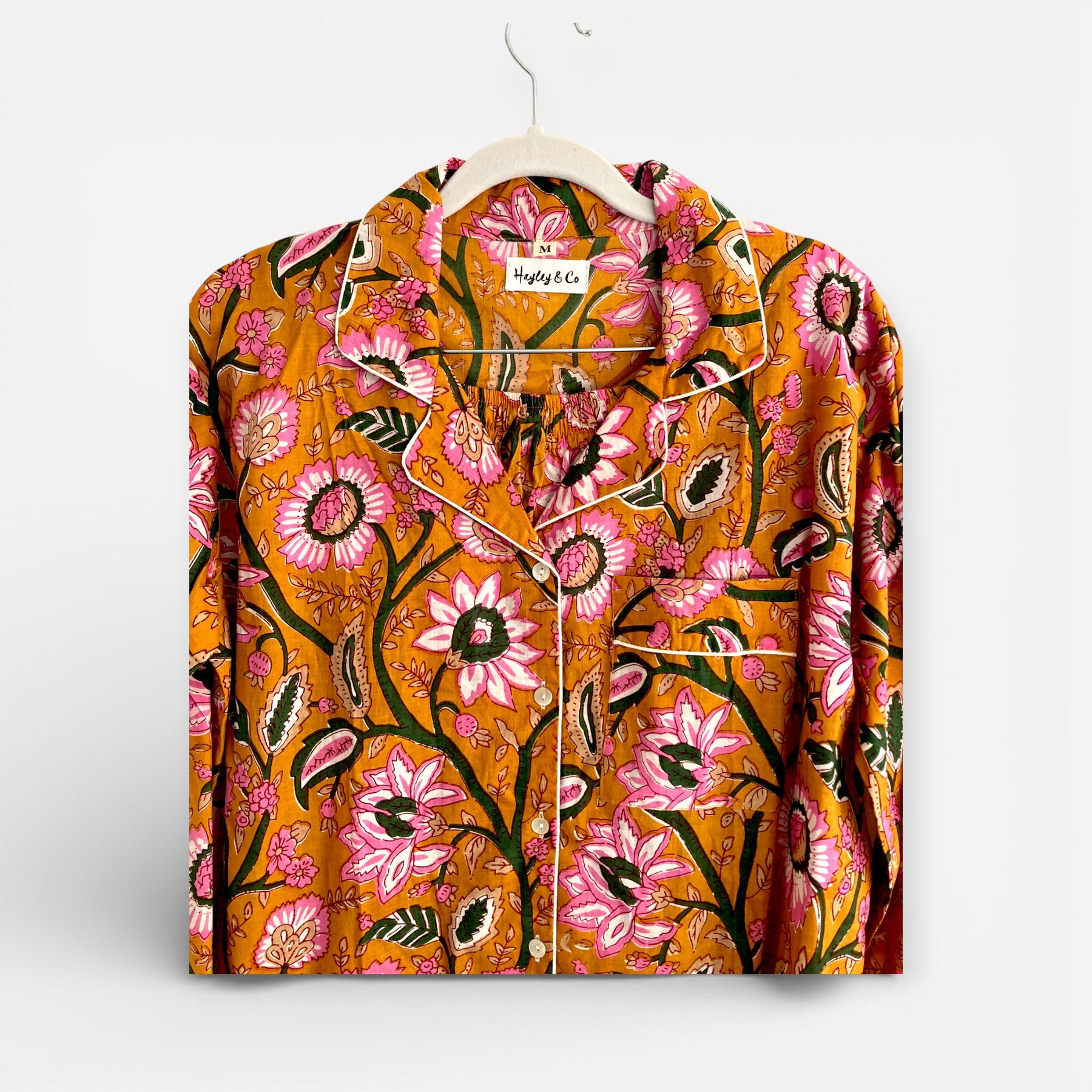 100% Cotton Pyjama Set featuring a beauiful block print floral on an Mustard Yellow background with highlights of Pink and Green.