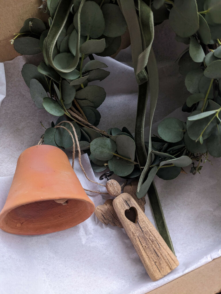 A thoughtful and timeless Christmas gift set featuring a handmade eucalyptus wreath, a wooden St. Lucia angel, and a handcrafted clay bell.