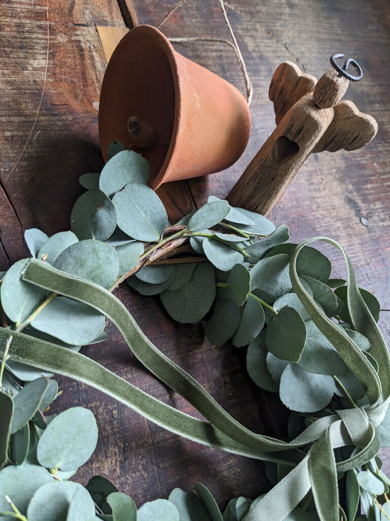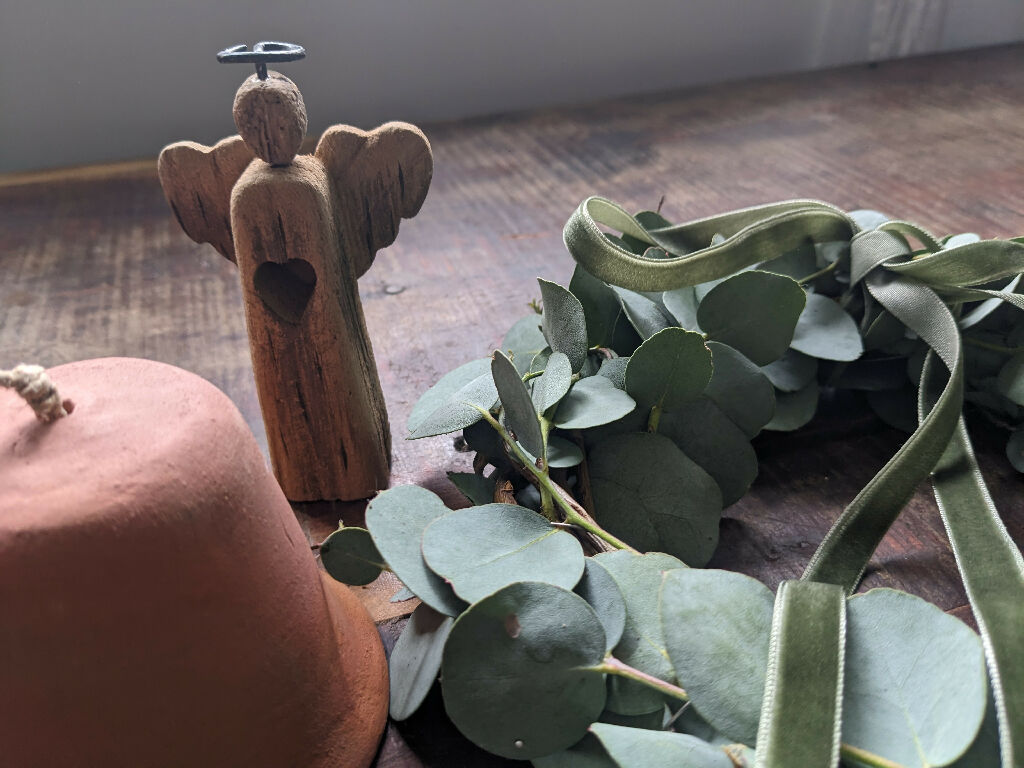 Includes: Eucalyptus wreath, St. Lucia angel, clay bell