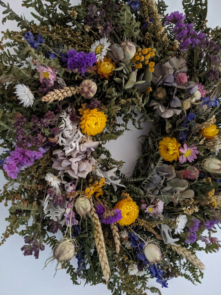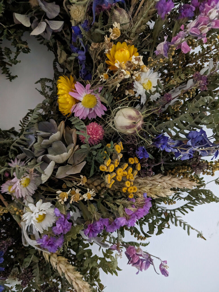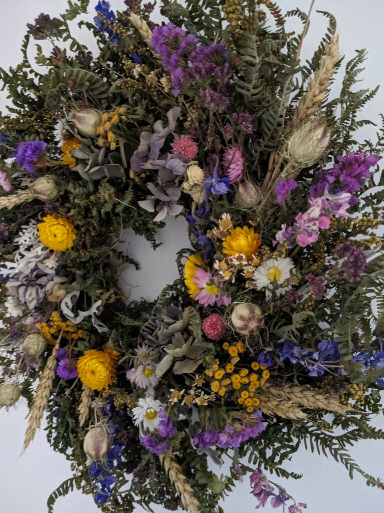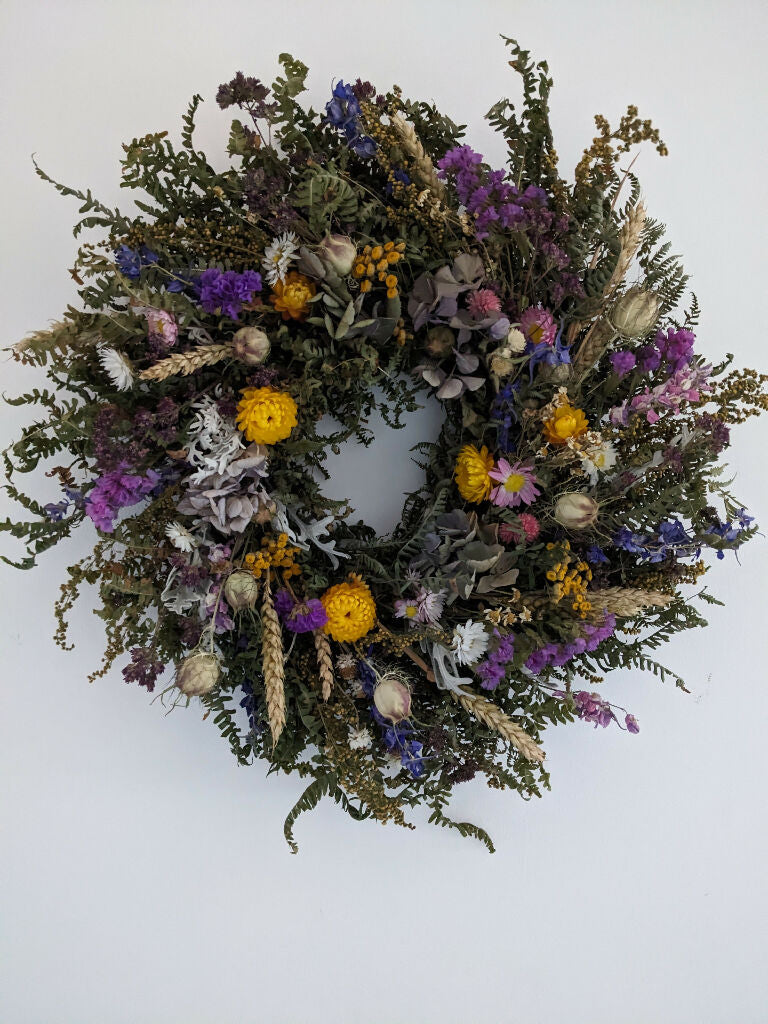 A stunning handmade wreath created from organically grown flowers harvested in West Sussex. Measuring approximately 40cm in diameter, this natural piece adds a bold yet elegant touch to any space.
