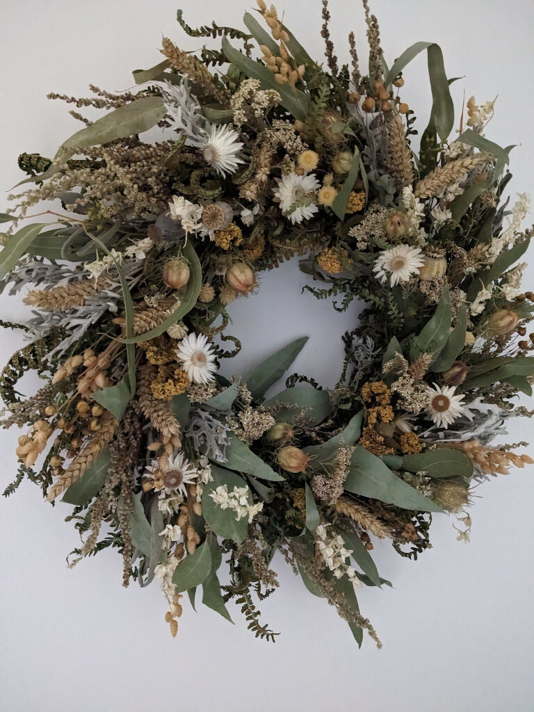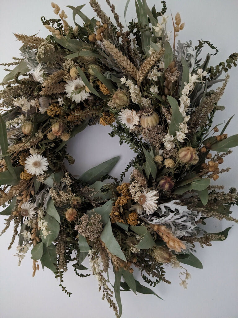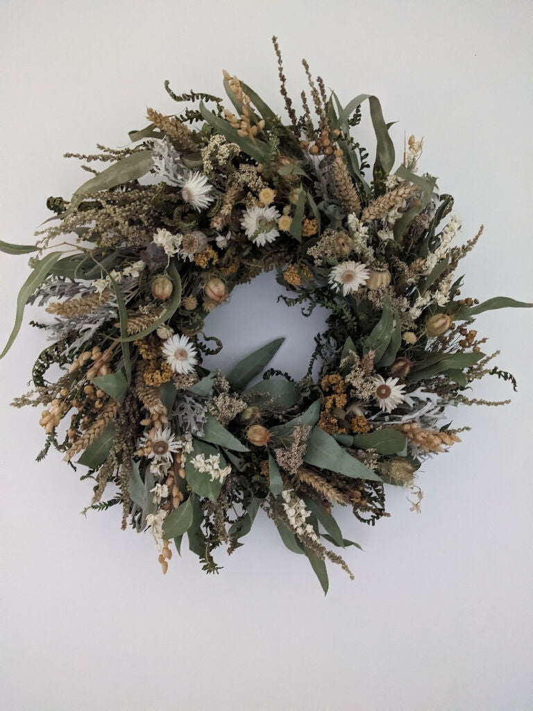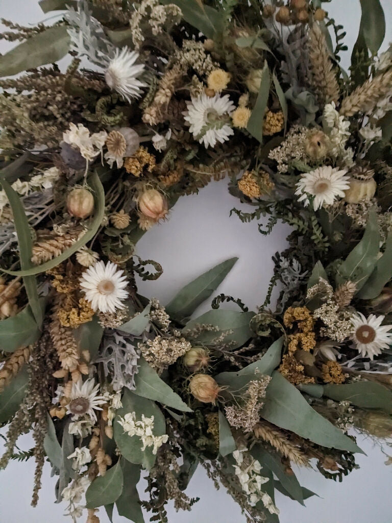 Natural dried flower wreath in muted colours. Approximately 50 cm.
