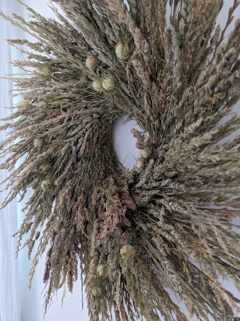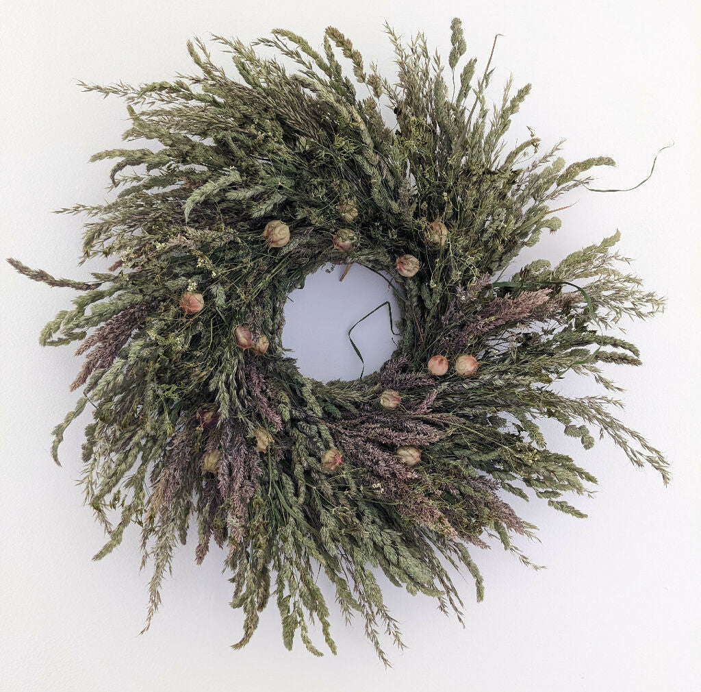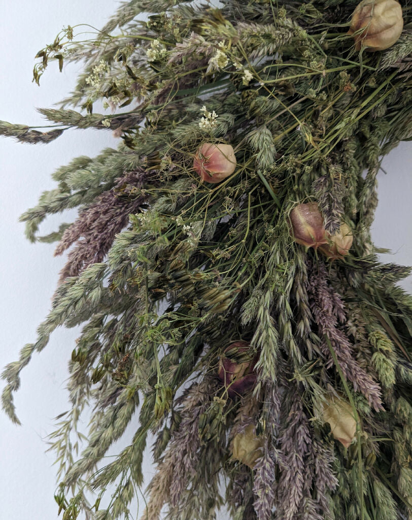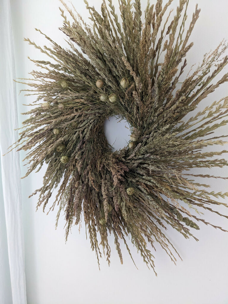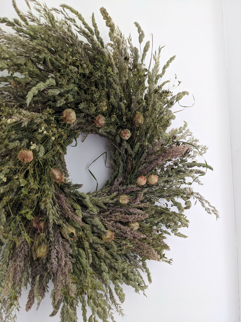Bring the calm beauty of the countryside into your home with this handcrafted foraged wreath. Featuring soft, neutral tones and a delicate blend of naturally dried grasses, cow parsley seed pods, and a touch of nigella, this piece adds quiet charm and texture to any space. Perfect for rustic interiors, nature lovers, or as a unique gift, each wreath is one of a kind, sustainably made with seasonal finds.