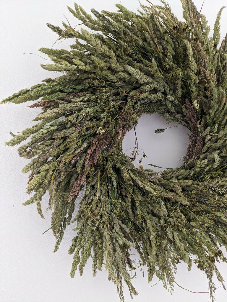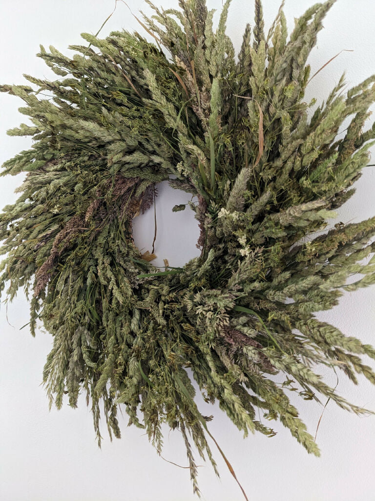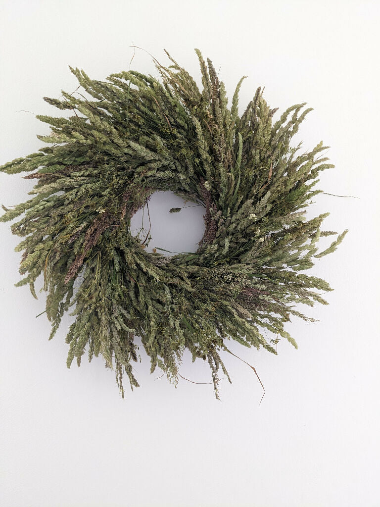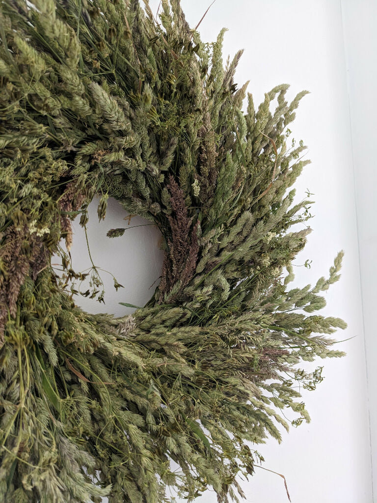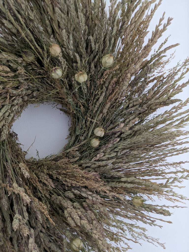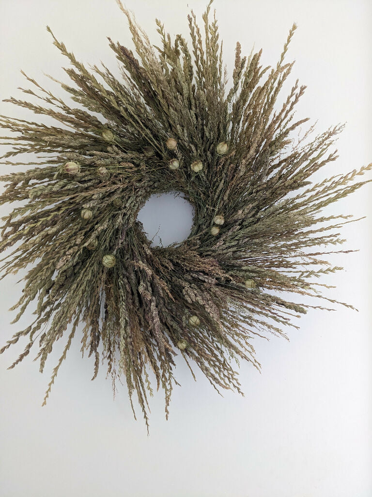 Bring the calm beauty of the countryside into your home with this handcrafted foraged wreath. Featuring soft, neutral tones and a delicate blend of naturally dried grasses, cow parsley seed pods, and a touch of nigella, this piece adds quiet charm and texture to any space. Perfect for rustic interiors, nature lovers, or as a unique gift, each wreath is one of a kind, sustainably made with seasonal finds.