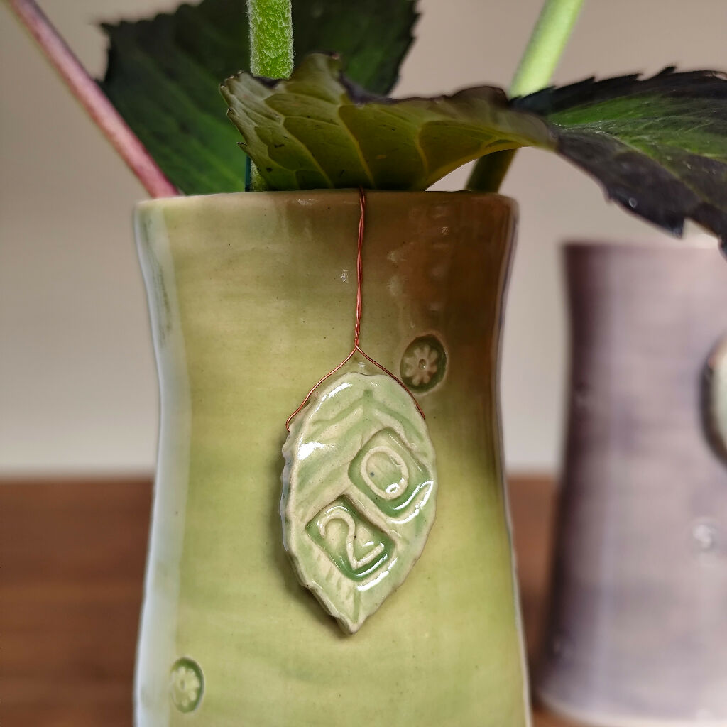 The vase is complete with a ceramic tag in the shape of a leaf, where the number 20 is stamped into the clay. There are 3 colour options. The tag is threaded with a thin copper wire and hooks at the edge of the vase, which makes it easy to remove.