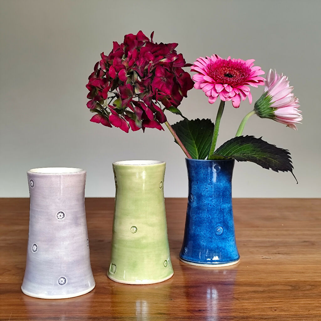 Each vase has been thrown on the pottery wheel from white stoneware clay. Decorative handmade stamps are applied to the clay. Once bisque fired, the vases are glazed with eye-catching glazes on the outside and transparent glaze on the inside.