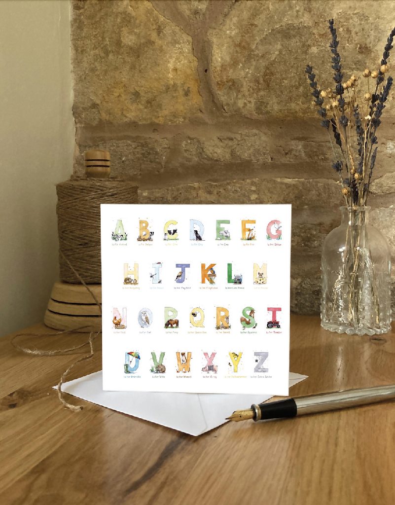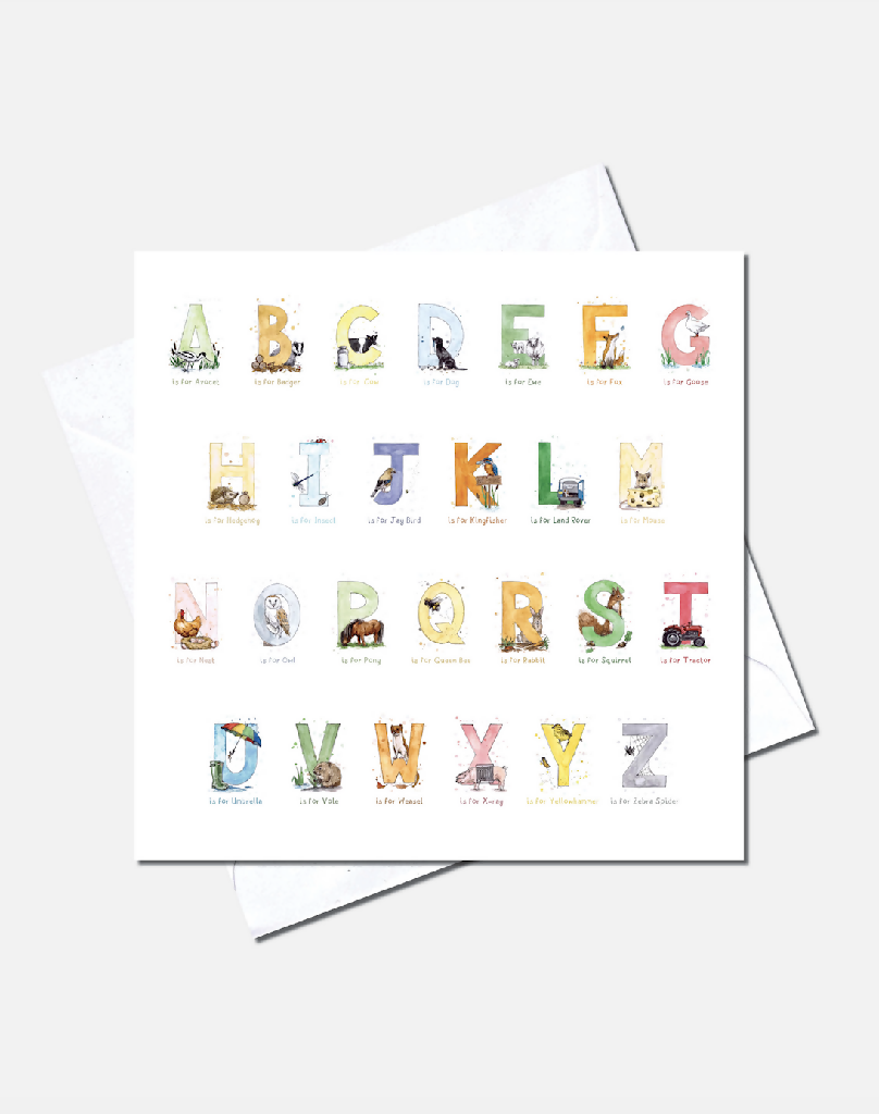 Featuring a beautiful set of ink and watercolour illustrations each depicting a letter of the alphabet. Each letter depicts a well known creature from British countryside ie H is for Hedgehog. Matching limited Edition Print available.