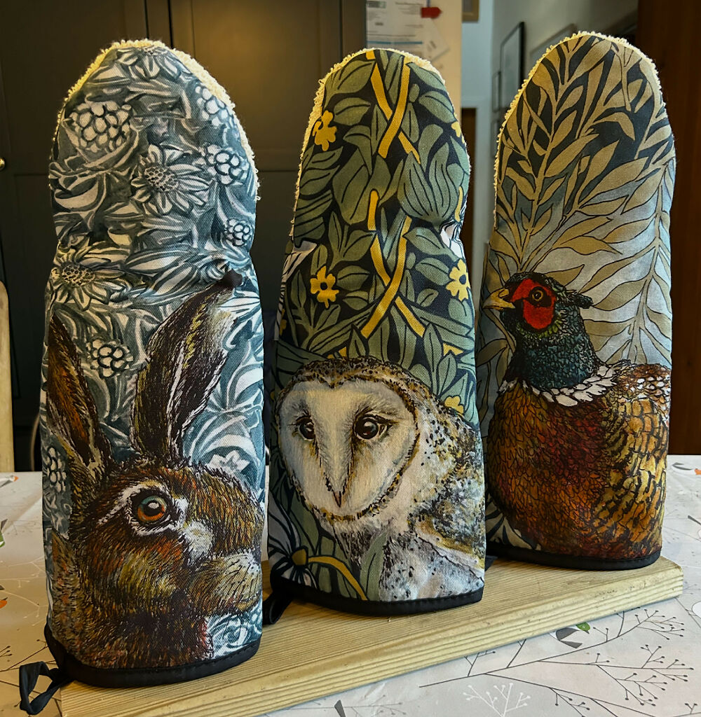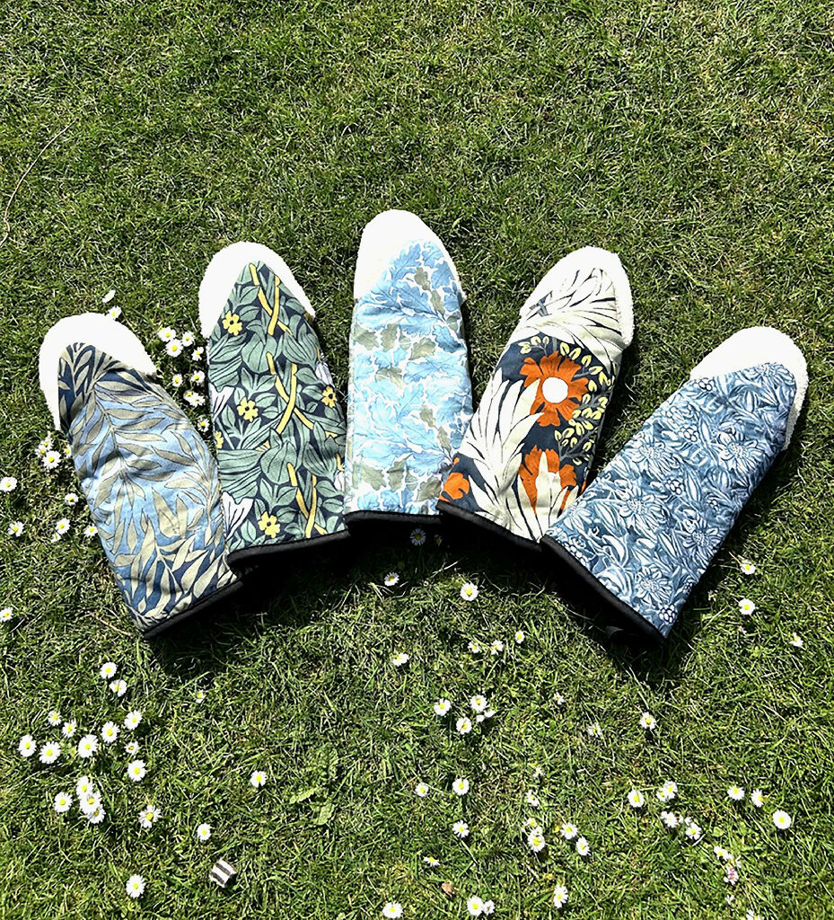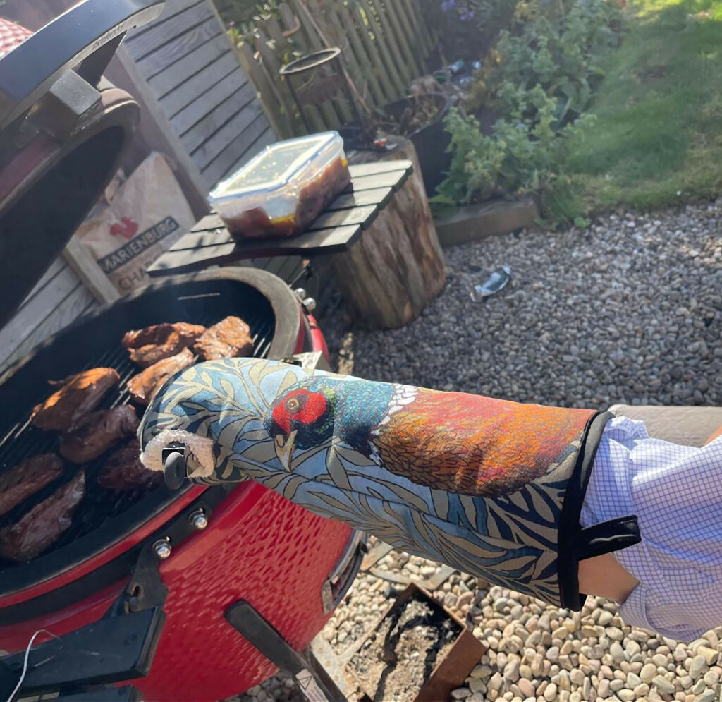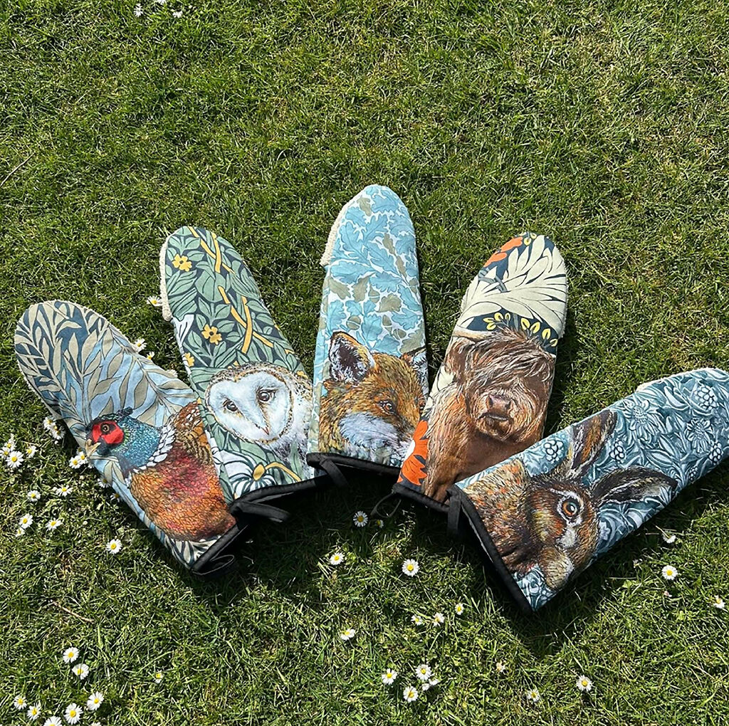 Aga gauntlets, BBQ Mitt. Made in the UK to the highest spec in 5 different unique designs based on the designs of Lainey Miller. Matching Aga Covers and Aprons.
