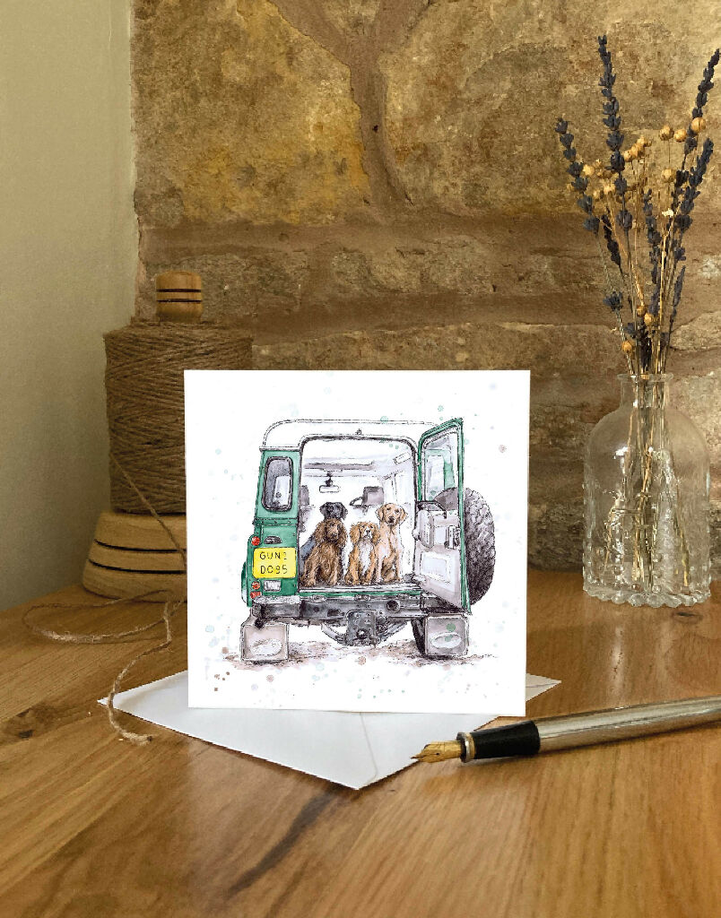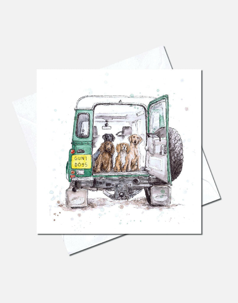 Featuring an ink and watercolour illustration of the rear of a classic Landrover filled with dogs on a country day out. Matching personalised print also available.