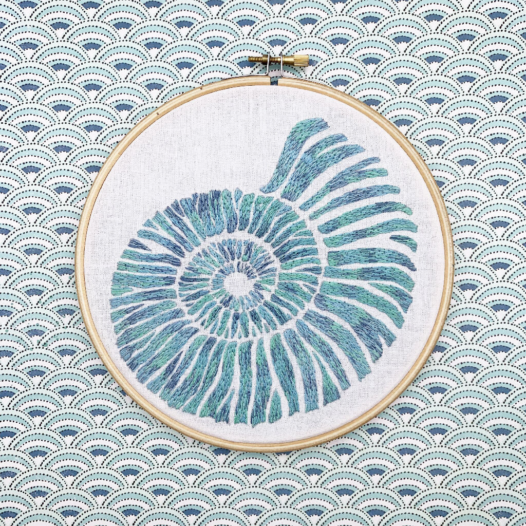 This ammonite shell embroidery kit is inspired by the beautiful spiral shapes found in nature. Ammonites are sometimes called nautilus shells, and this timeless design captures that iconic form in thread, making it a striking and relaxing hand embroidery project.