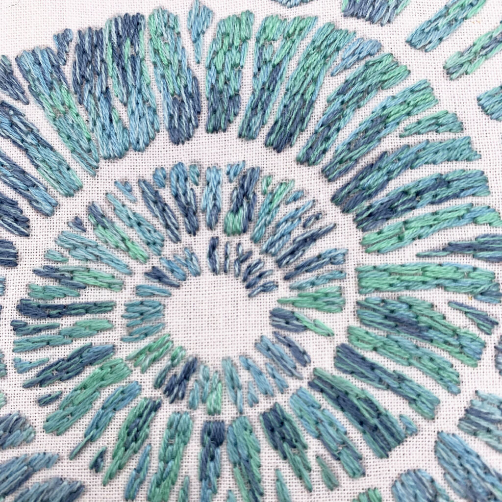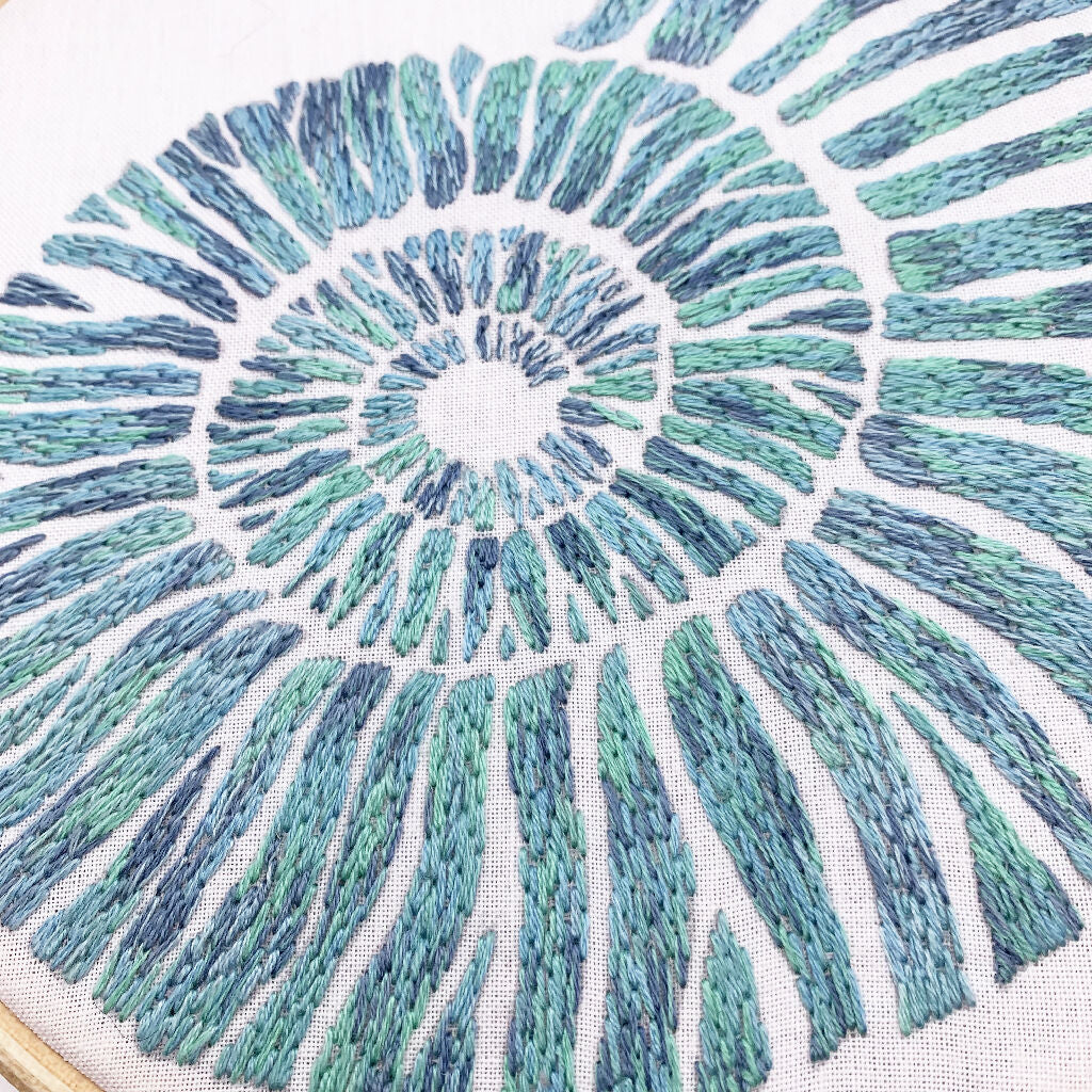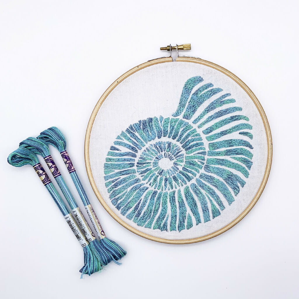 The design is stitched using variegated embroidery threads, which gently change colour as you work. These flowing colour shifts add depth and texture, ensuring every finished piece is completely unique — no two ammonite shells will ever look exactly the same.