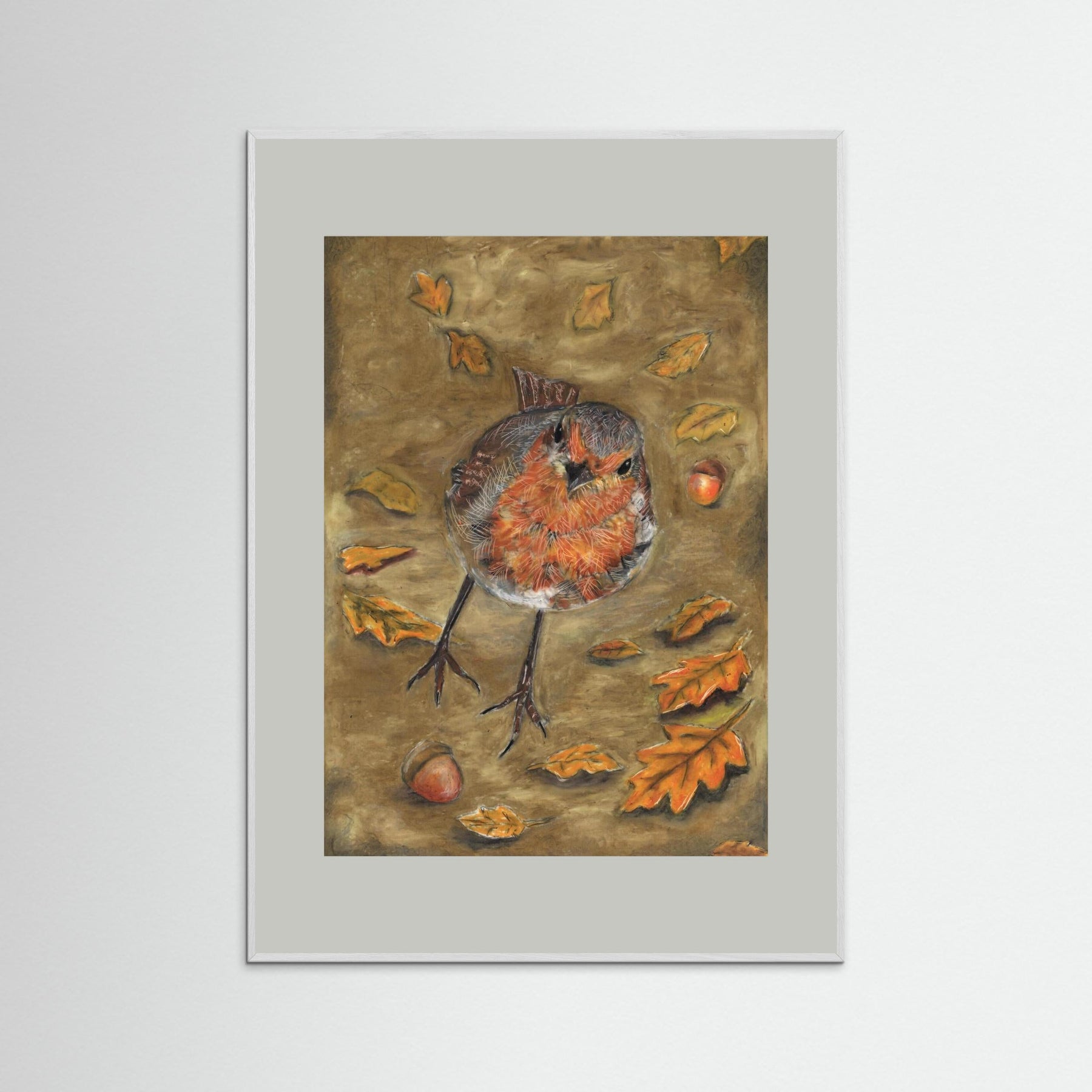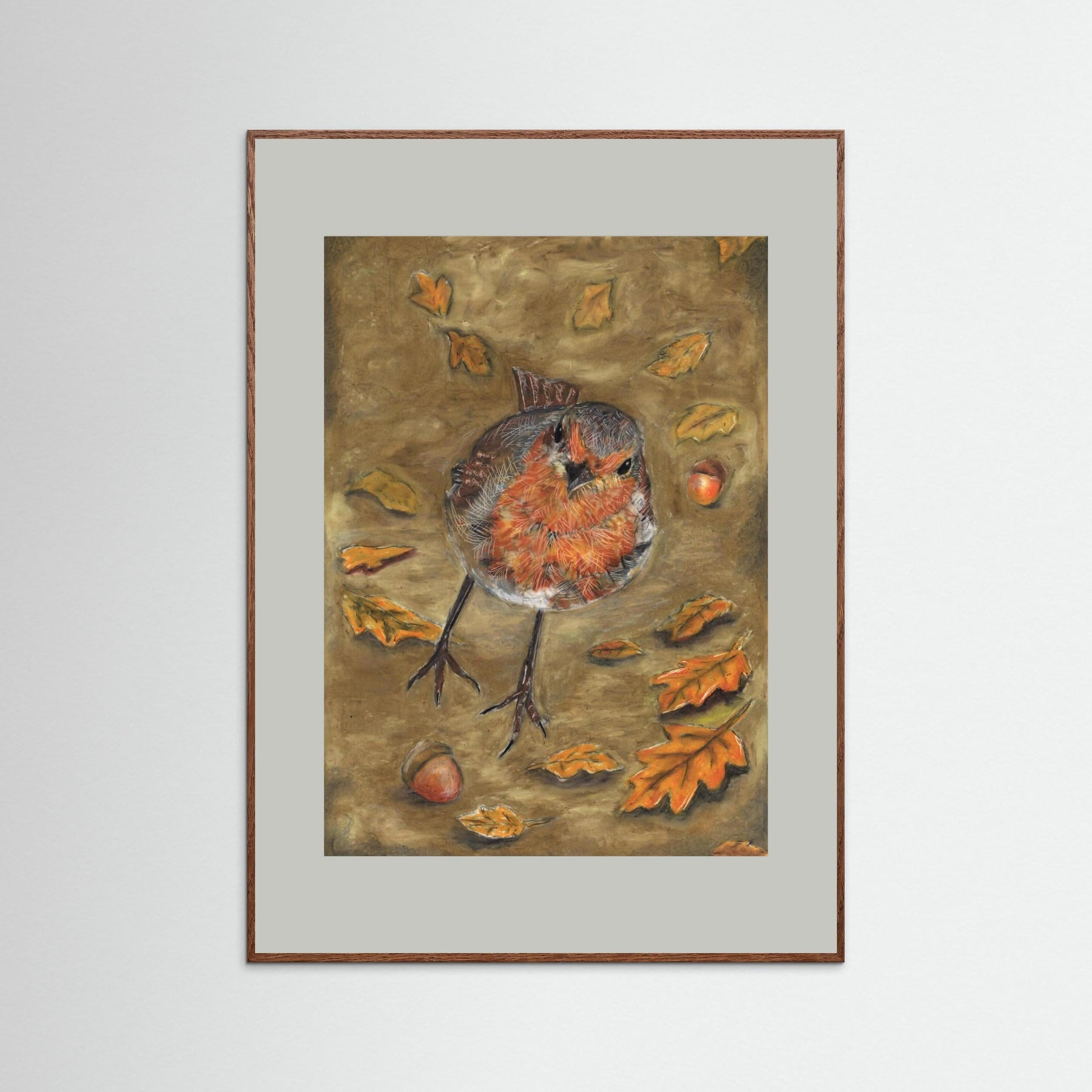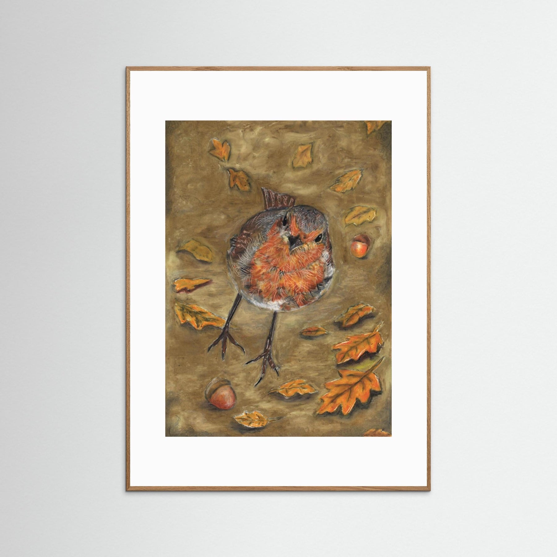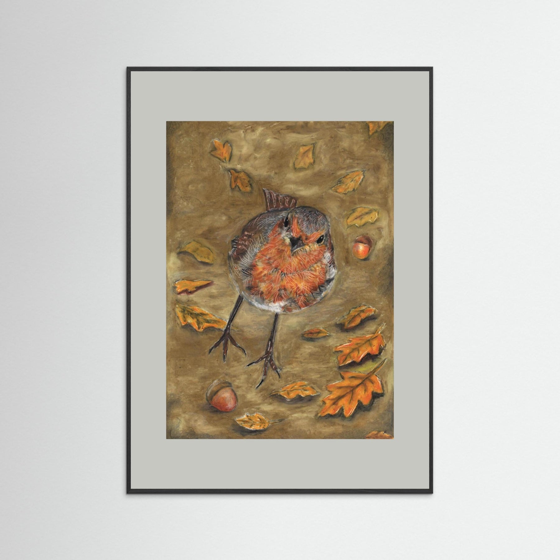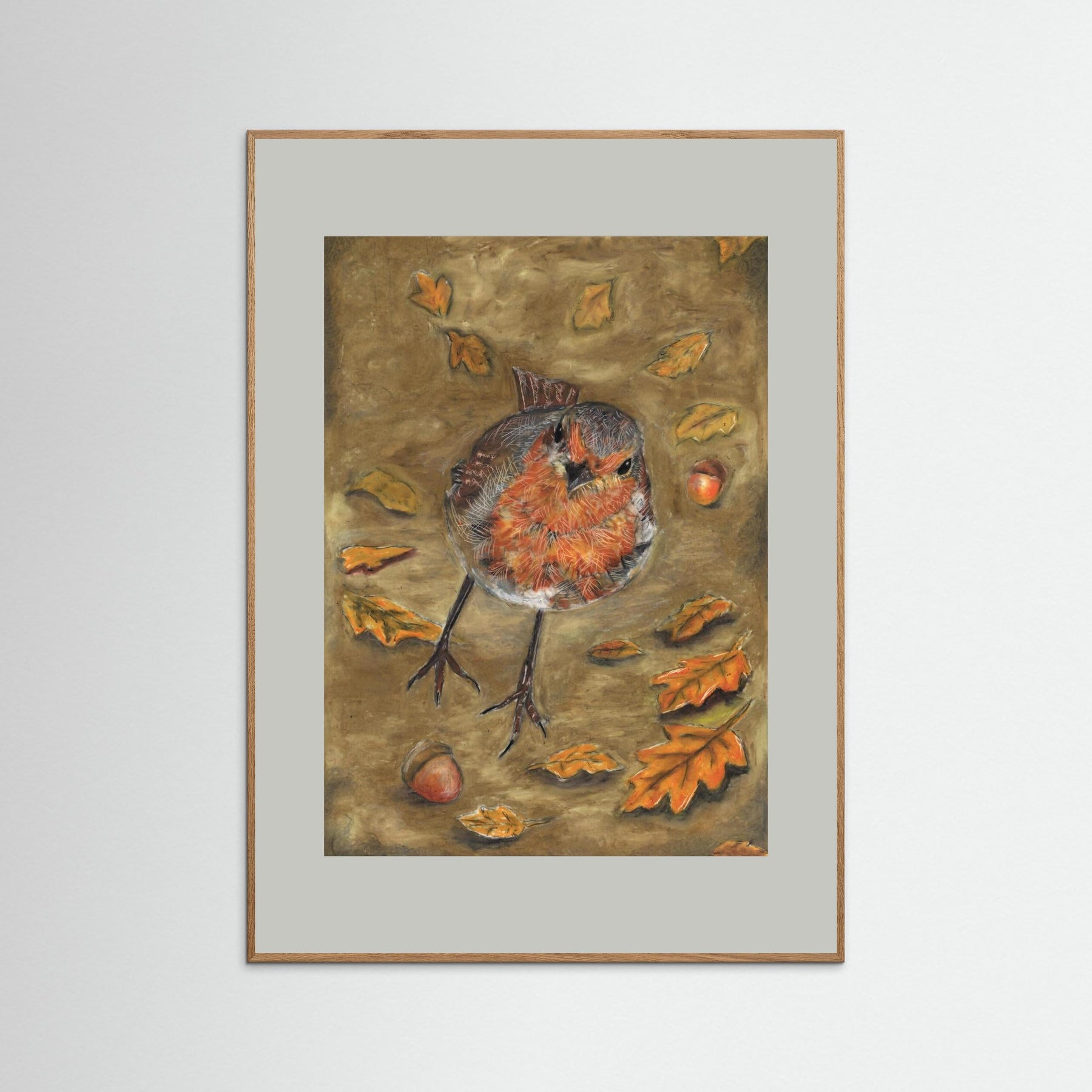 Robin Print That Warms the Heart in Every Season Celebrate the charm of Britain’s most beloved garden bird with this autumn robin artwork print. Surrounded by golden leaves and acorns, the robin’s fiery breast shines with warmth against the earthy backdrop of fall. Hand-drawn with care and detail, this piece captures the comfort and familiarity of the robin — a bird that brings joy to the garden all year round.