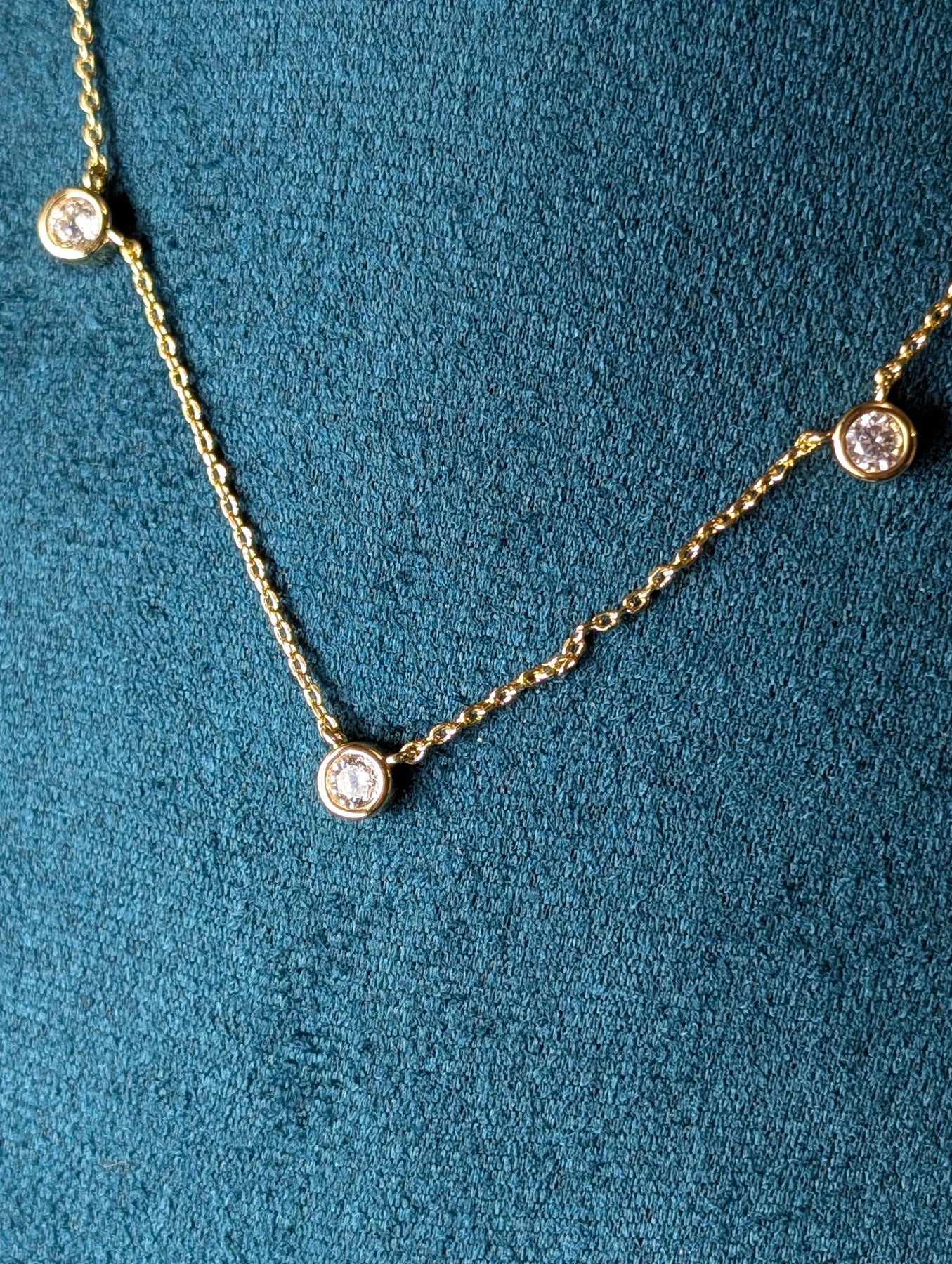 Our choker with three radiant stones shimmer like stars reflected in the cool night ocean — a delicate reminder of your subtle statement of strength and serenity.