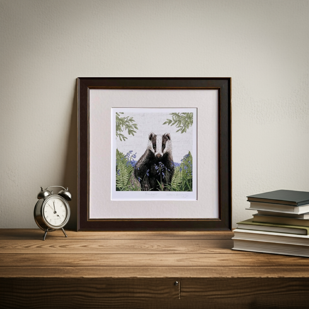 Inspired by the beauty of the British Countryside this hand-drawn print with an etched feel depicts a badger in the dappled shade of wood.