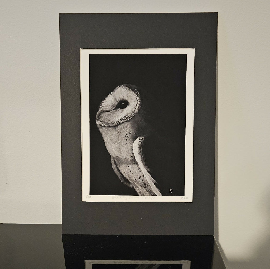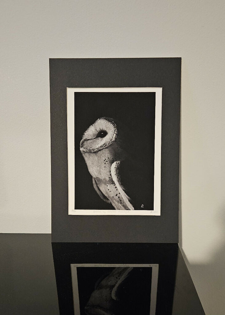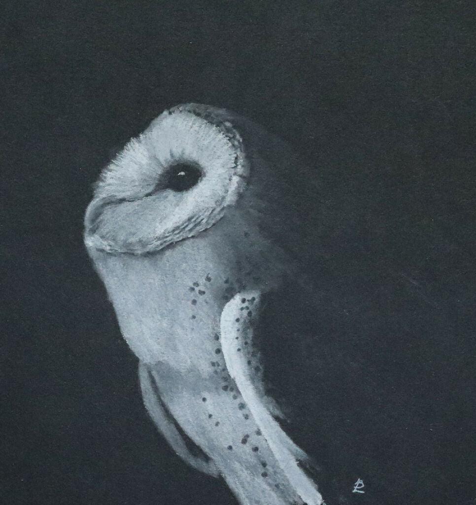 A limited edition giclee print of my original chalk on black paper drawing, Bathed by Ethereal Moonlight, of a female barn owl looking up at the moon which is casting soft light on her, drawing her out of the shadows.