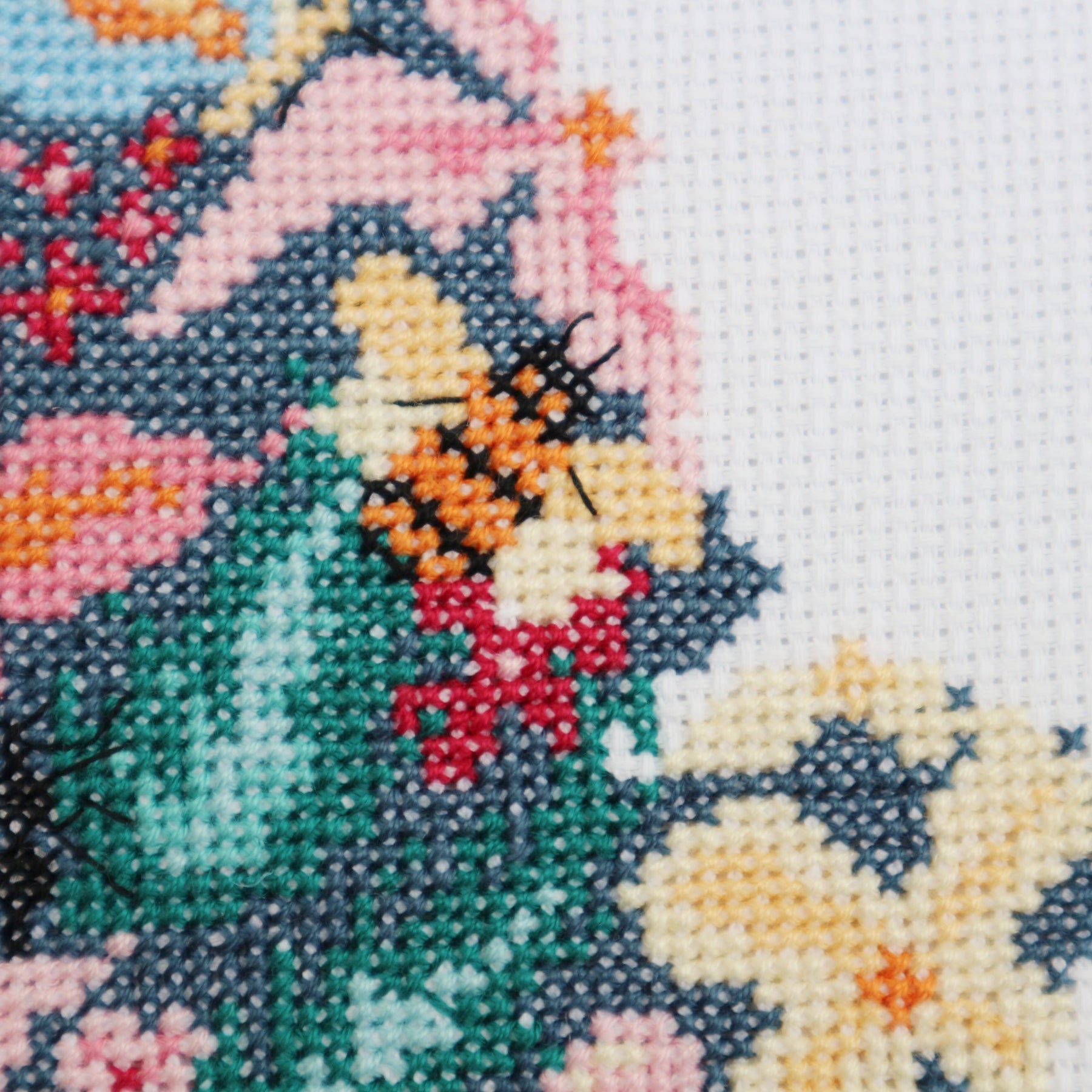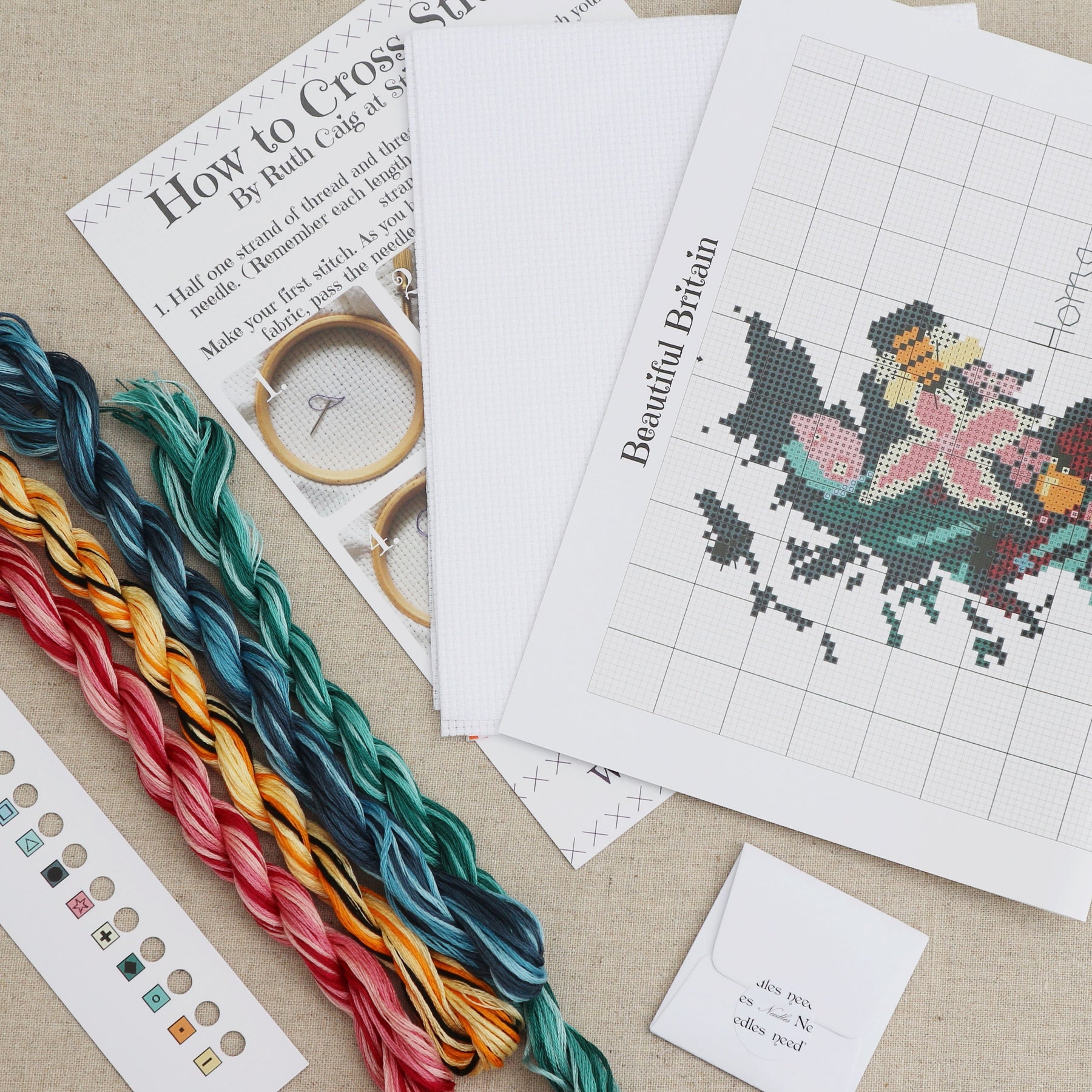 Your kit contains: • A coloured counted cross stitch chart • High-quality DMC cottons, in the 12 colours needed to complete the picture. • white Zweigart, cotton 14-count Aida. • Two size 26 tapestry needles (a spare for all those times they escape) • A basic how-to cross stitch tutorial and finally a thread organiser card to help you sort your colours while working
