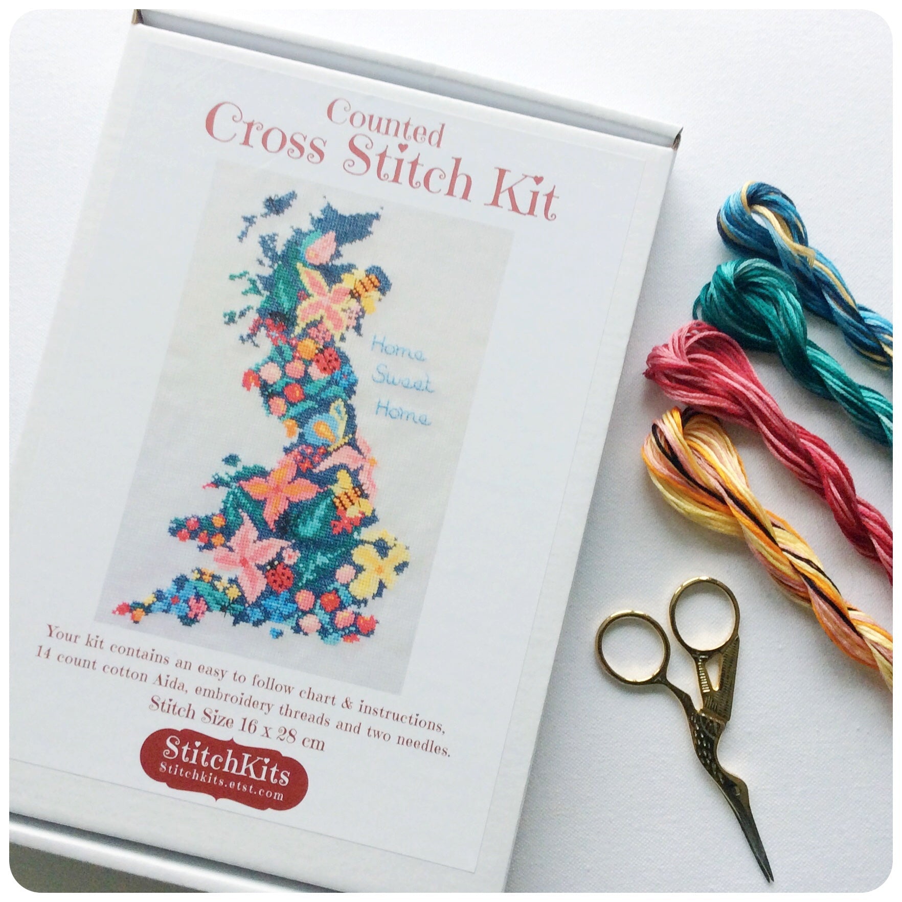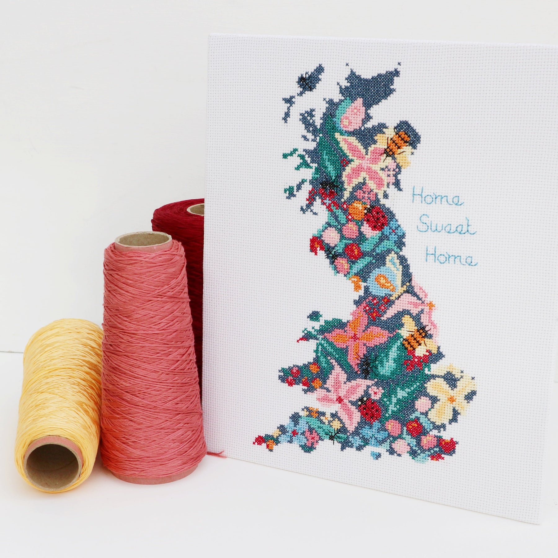 This is my 'Bee-autiful Britain - Home Sweet Home' cross-stitch kit. The kit contains everything you need to create this original, contemporary cross-stitch design.