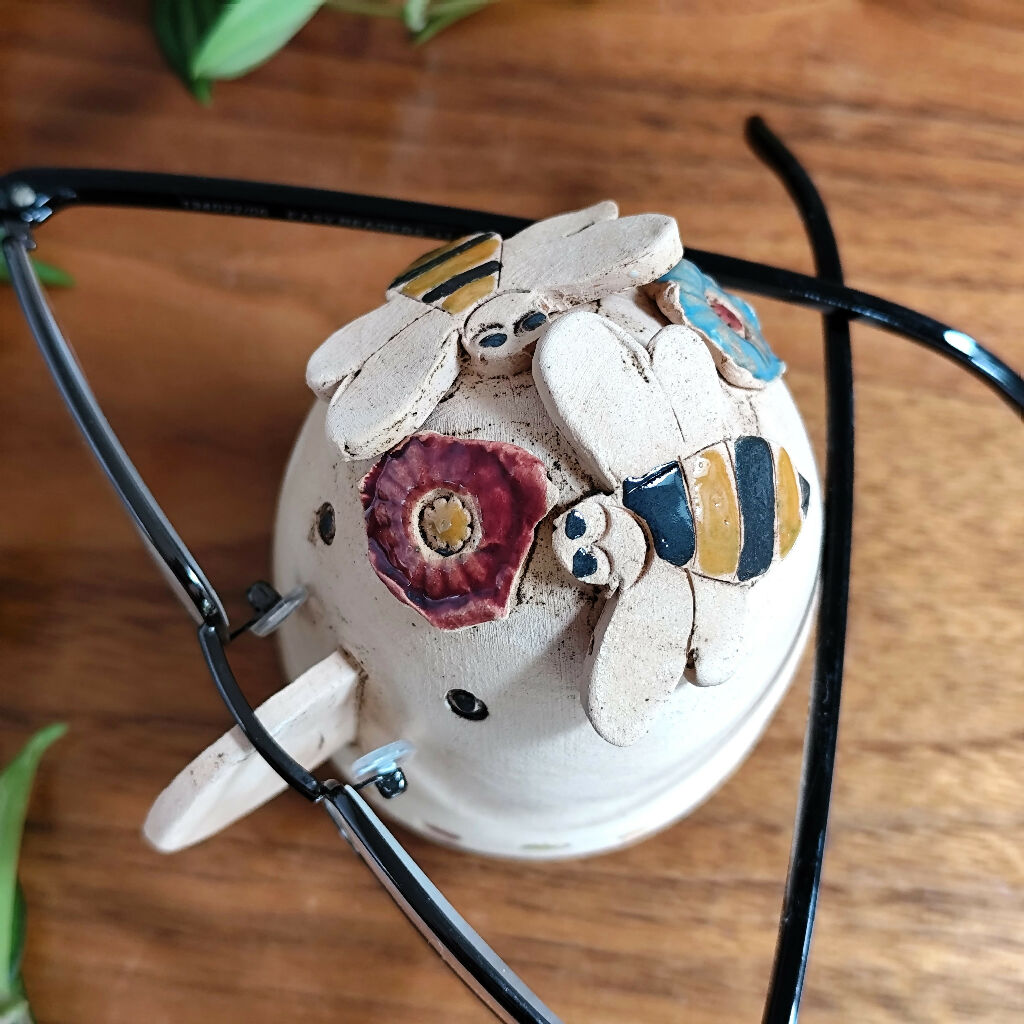 A ceramic spectacle stand, decorated with bees, bumble bees and multicoloured, vibrant flowers. An eye-catching, unique art piece that looks stunning even without the glasses on.