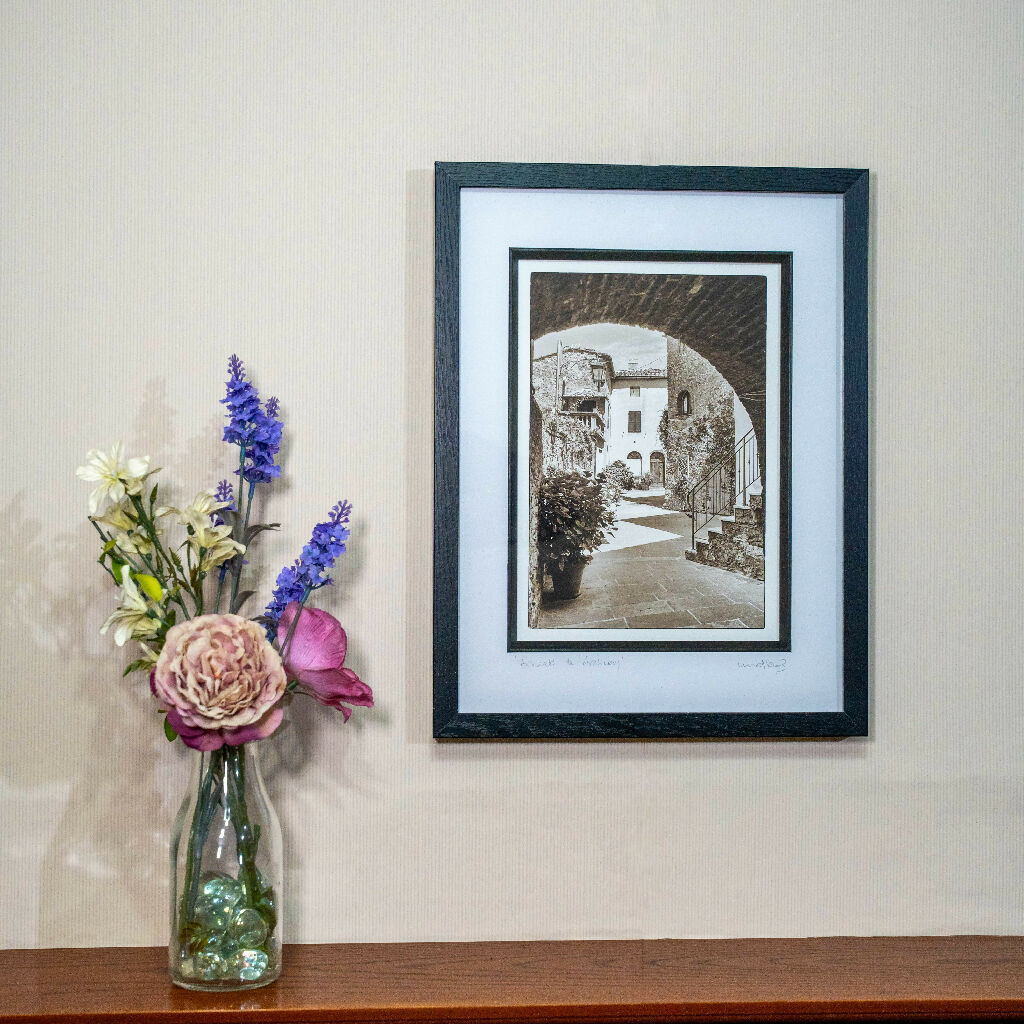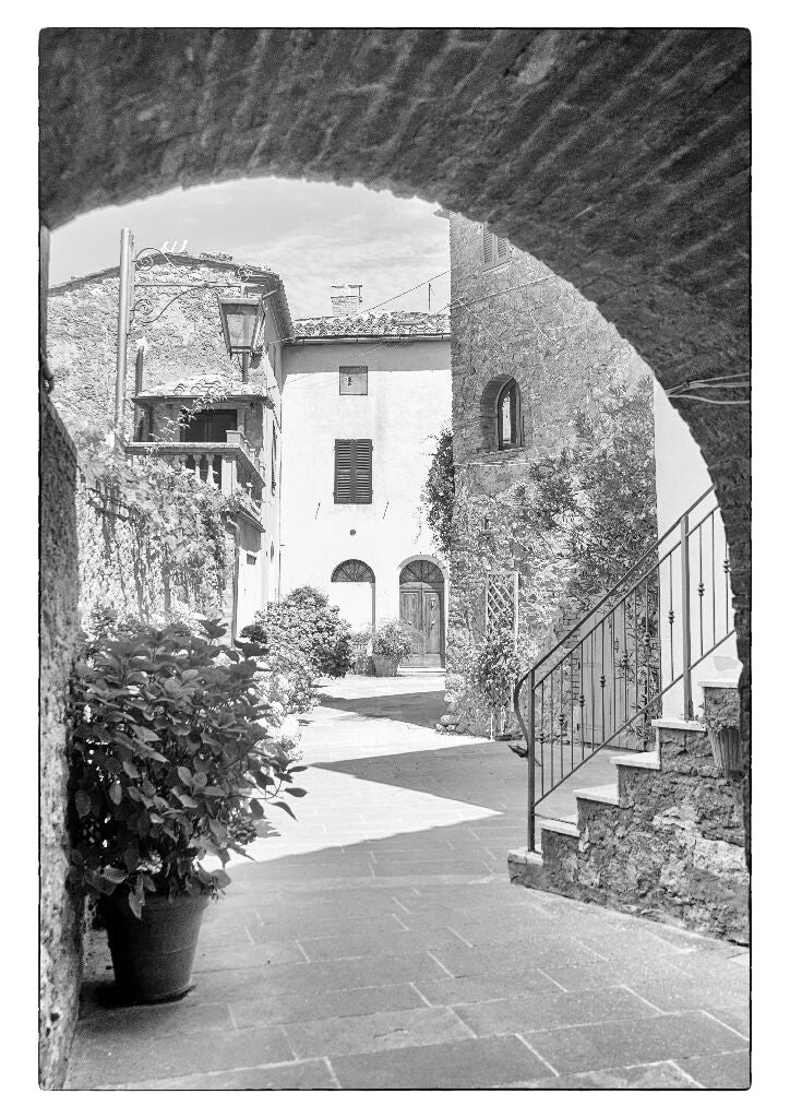 This monochrome photograph beautifully captures an iconic view of a Tuscan street as seen through a weathered stone archway in the hilltop village of Castle du Mustia, Tuscany. Printed on premium fine art paper and presented in elegant black frames with a deep black inlay.