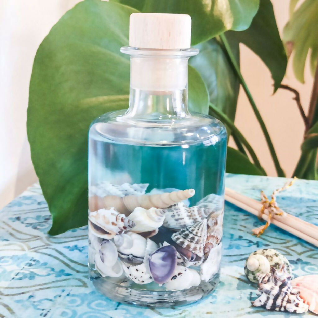 Combining beauty and elegance with an apothecary shaped glass containing real shells and an azure sea like fragrance oil reminiscent of pure white sands, crystal sparkling seas and exotic faraway escapes.