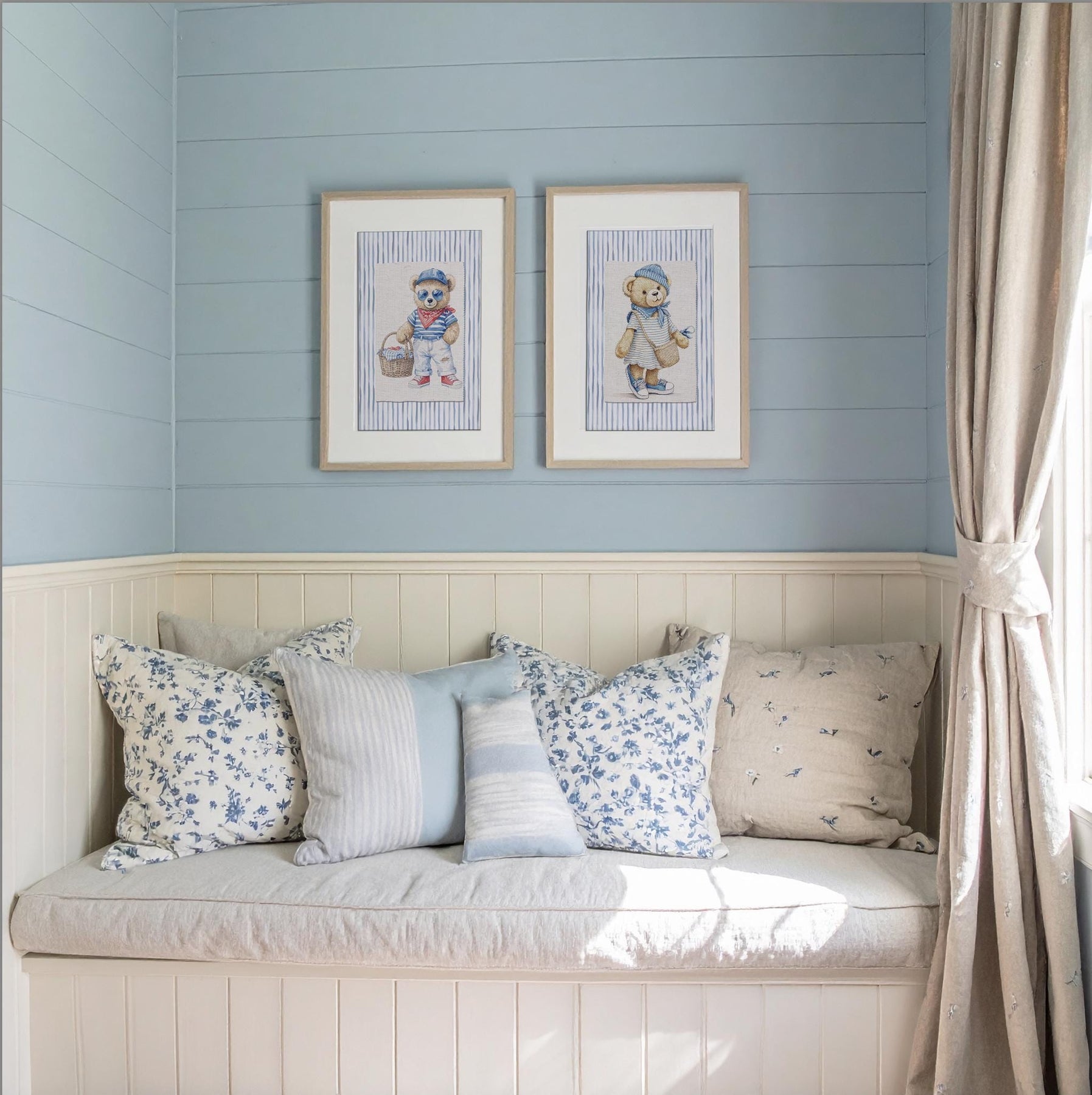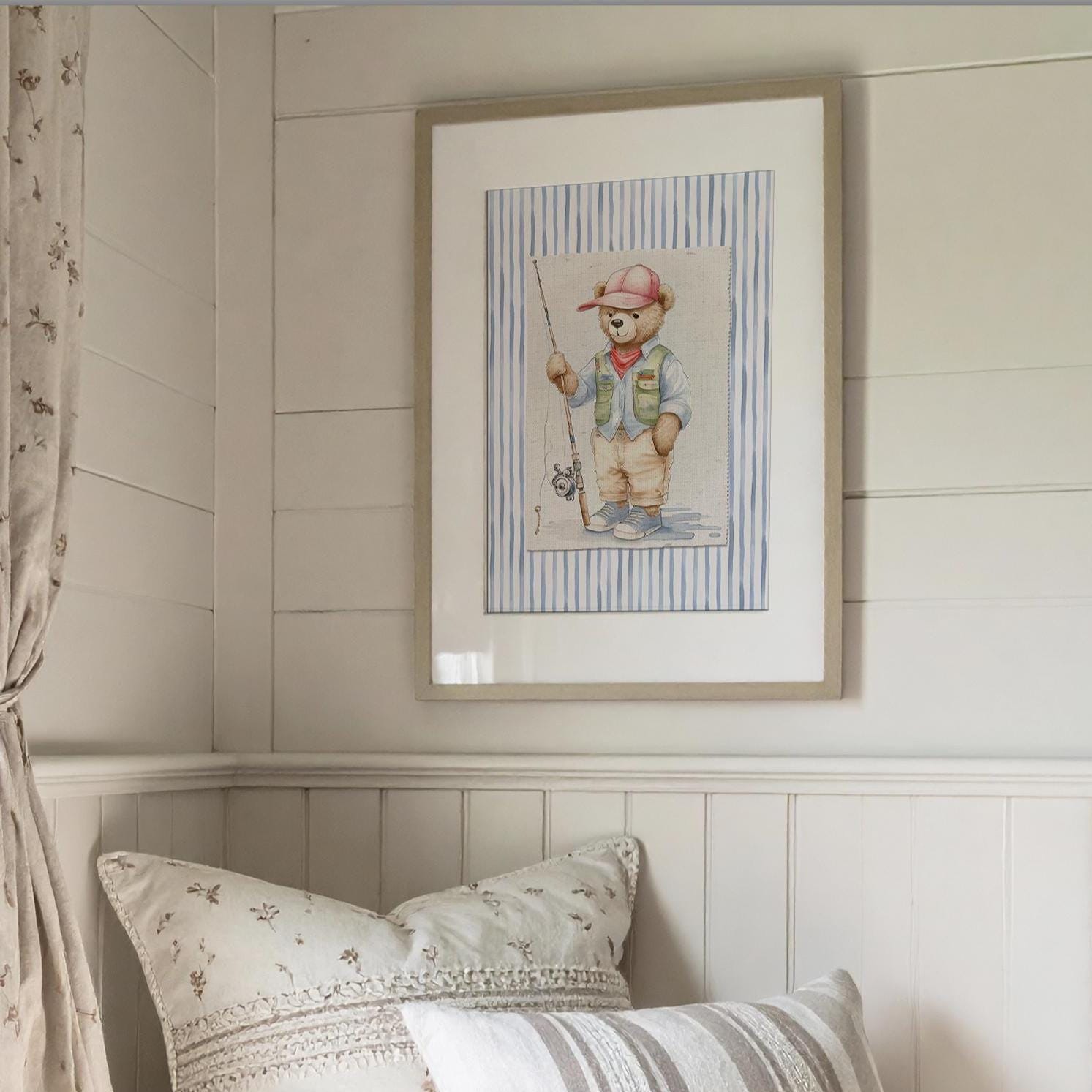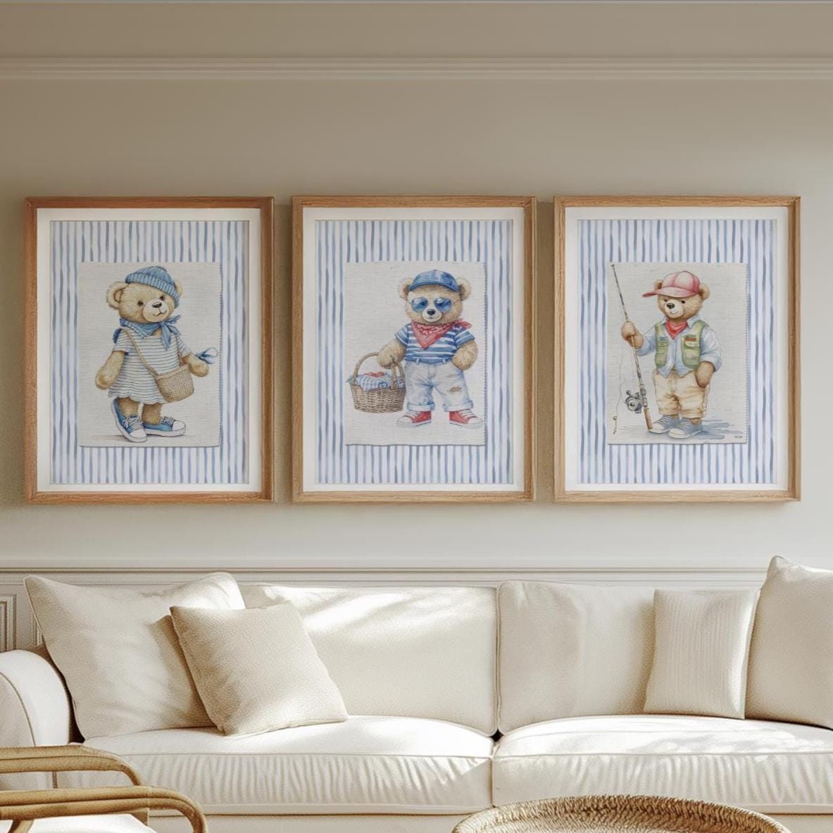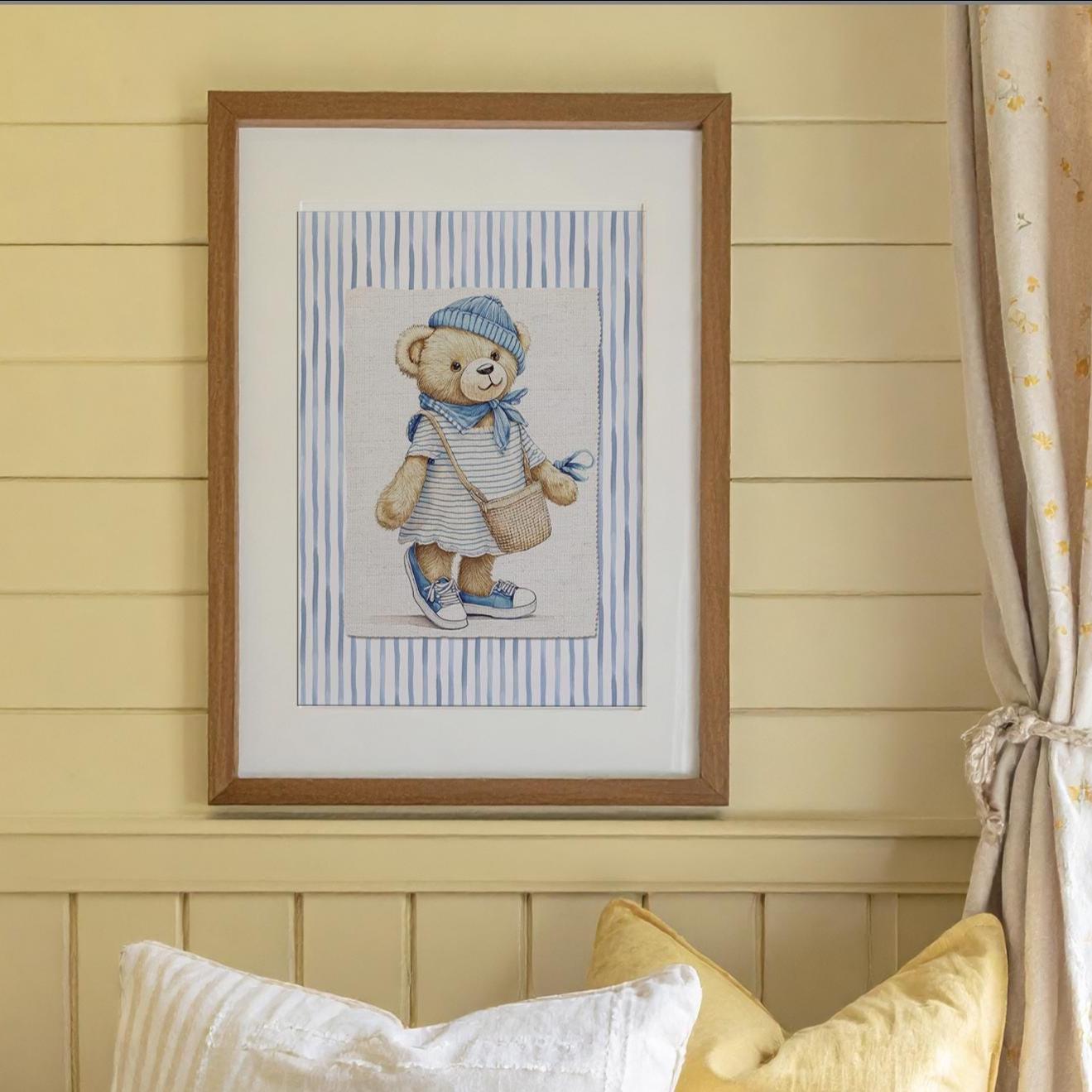 Iconic Bear illustrations finished in a vintage watercolor style, placed on a textile style background and set on organic blue striped wallpaper. Printed on Hahnemuehle Museum Etching Paper. A perfect addition to your nursery or children playroom.