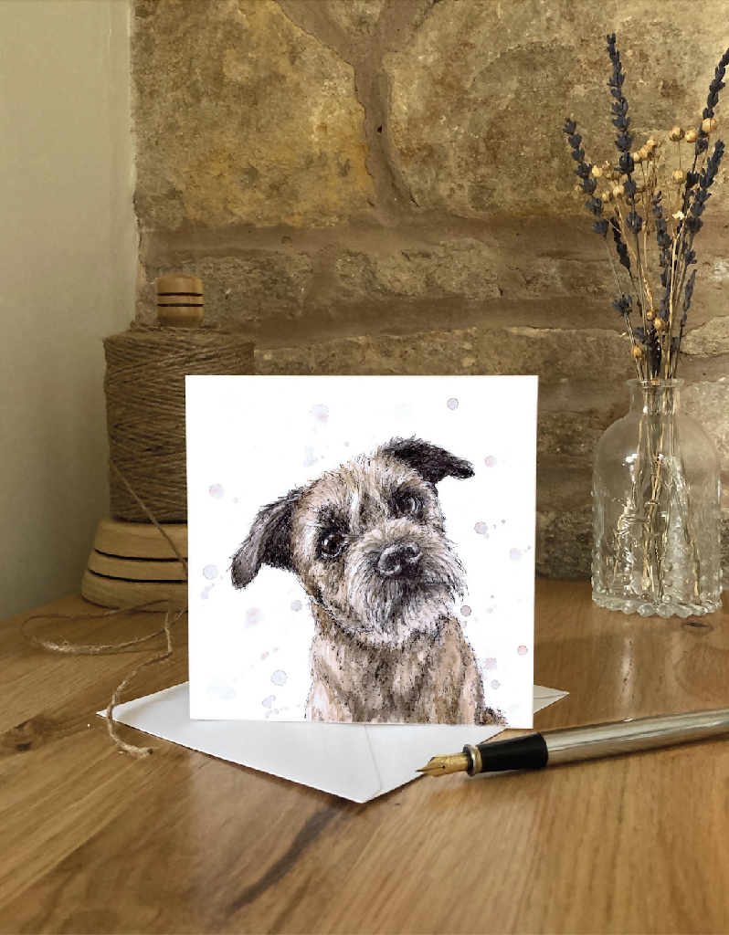 Featuring a cheeky ink and watercolour illustration of a border terrier.