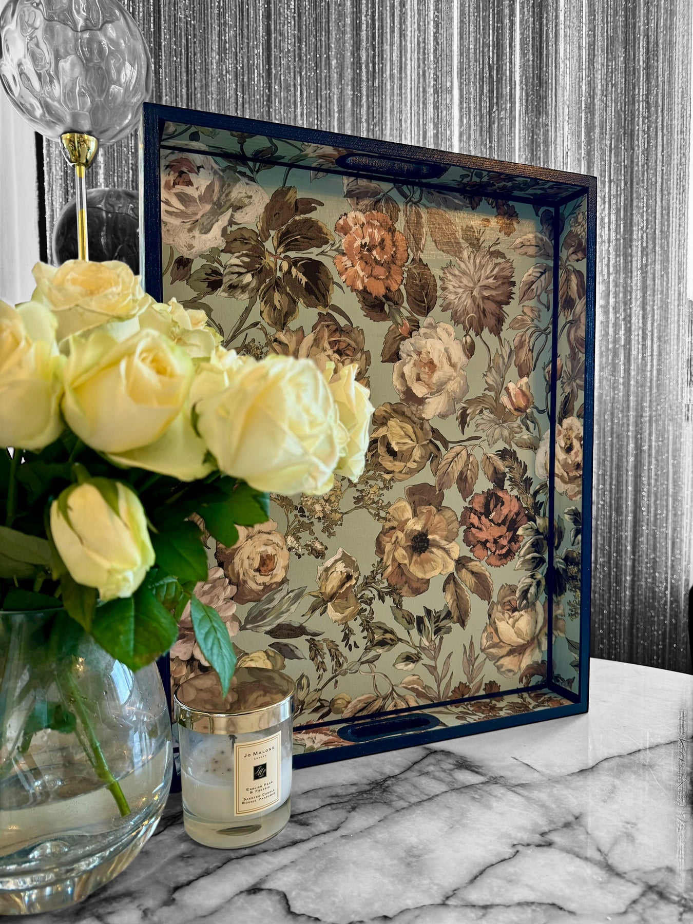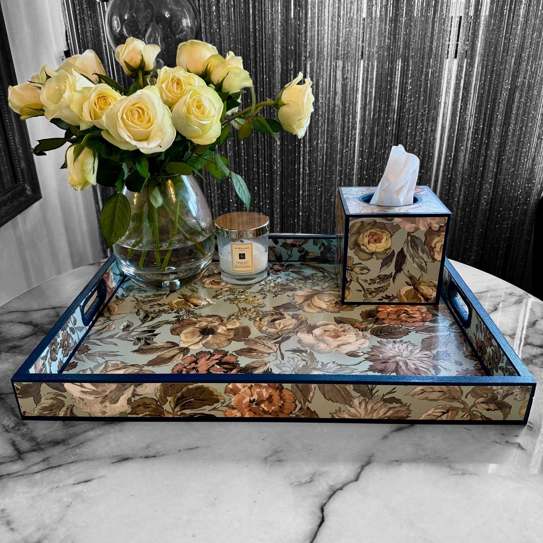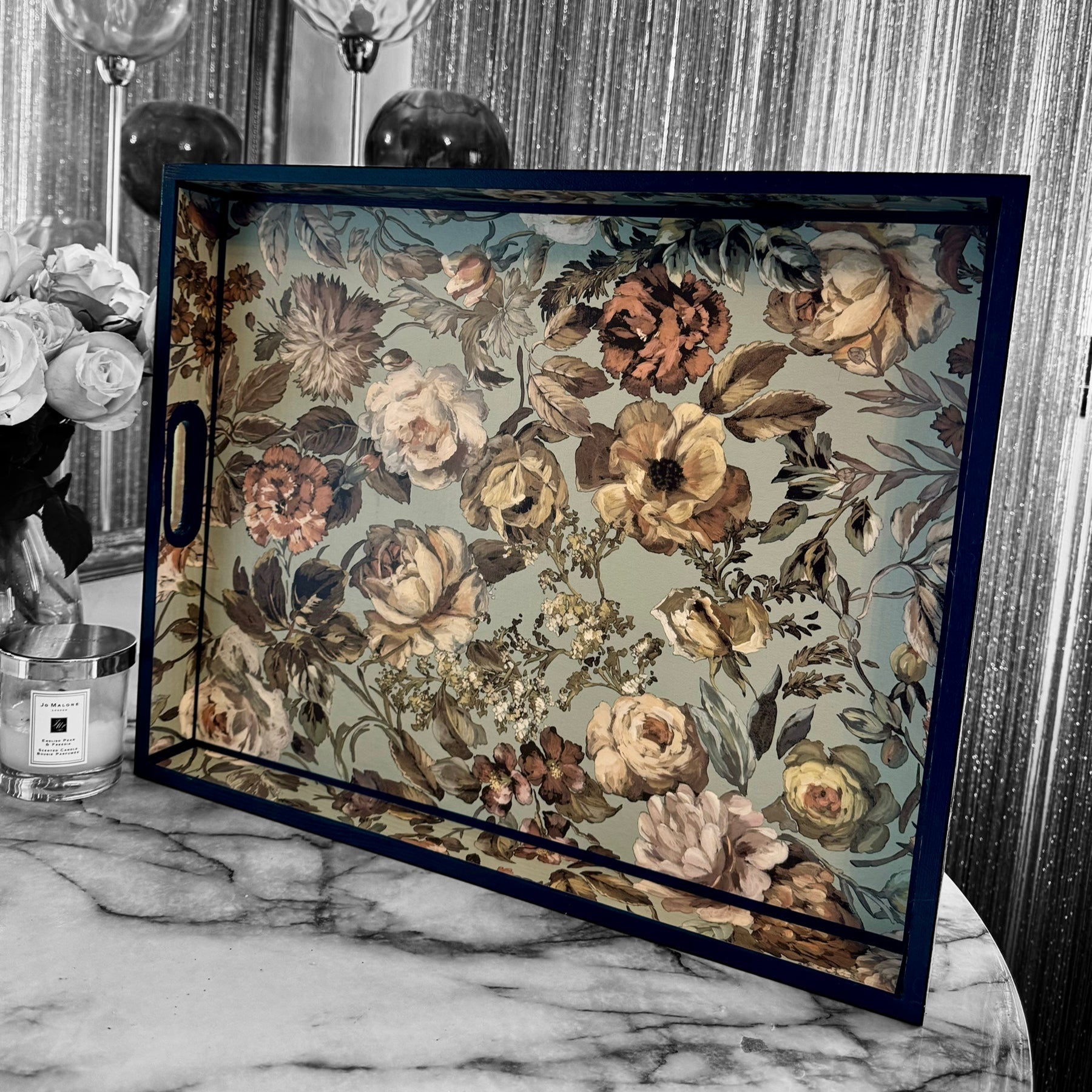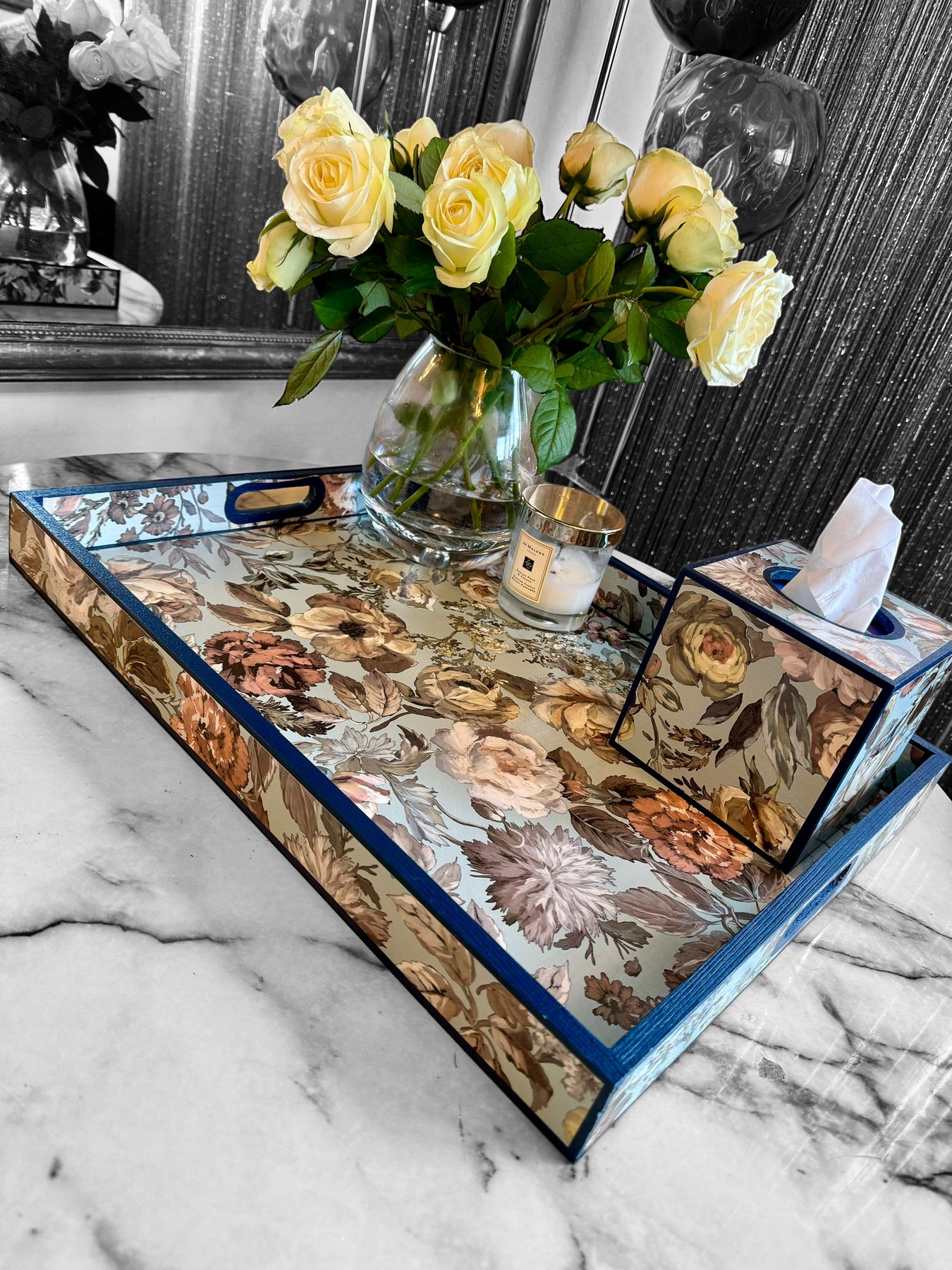 Each tray is meticulously decoupaged by hand and sealed with multiple layers of UV and water-resistant nanotechnology sealant, creating a smooth satin finish designed for long-lasting durability and everyday use.