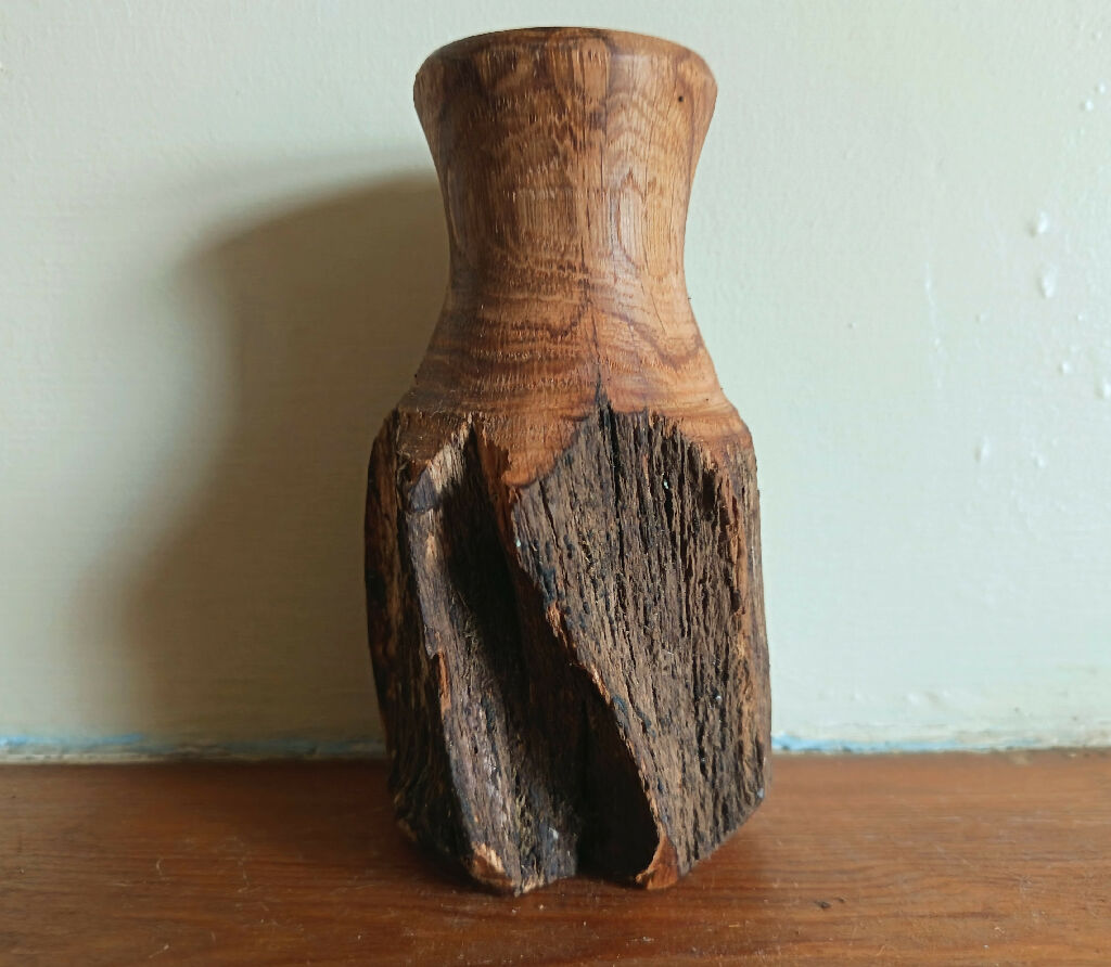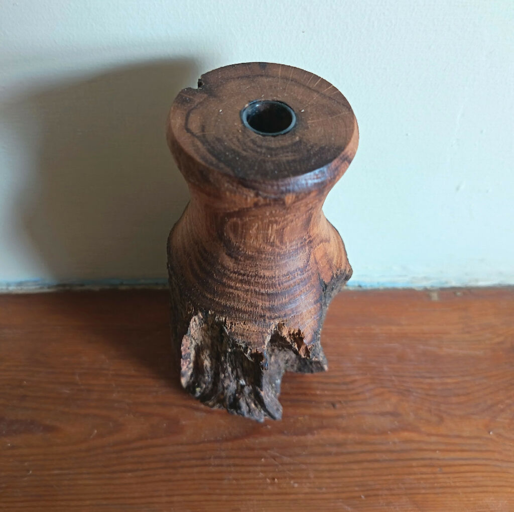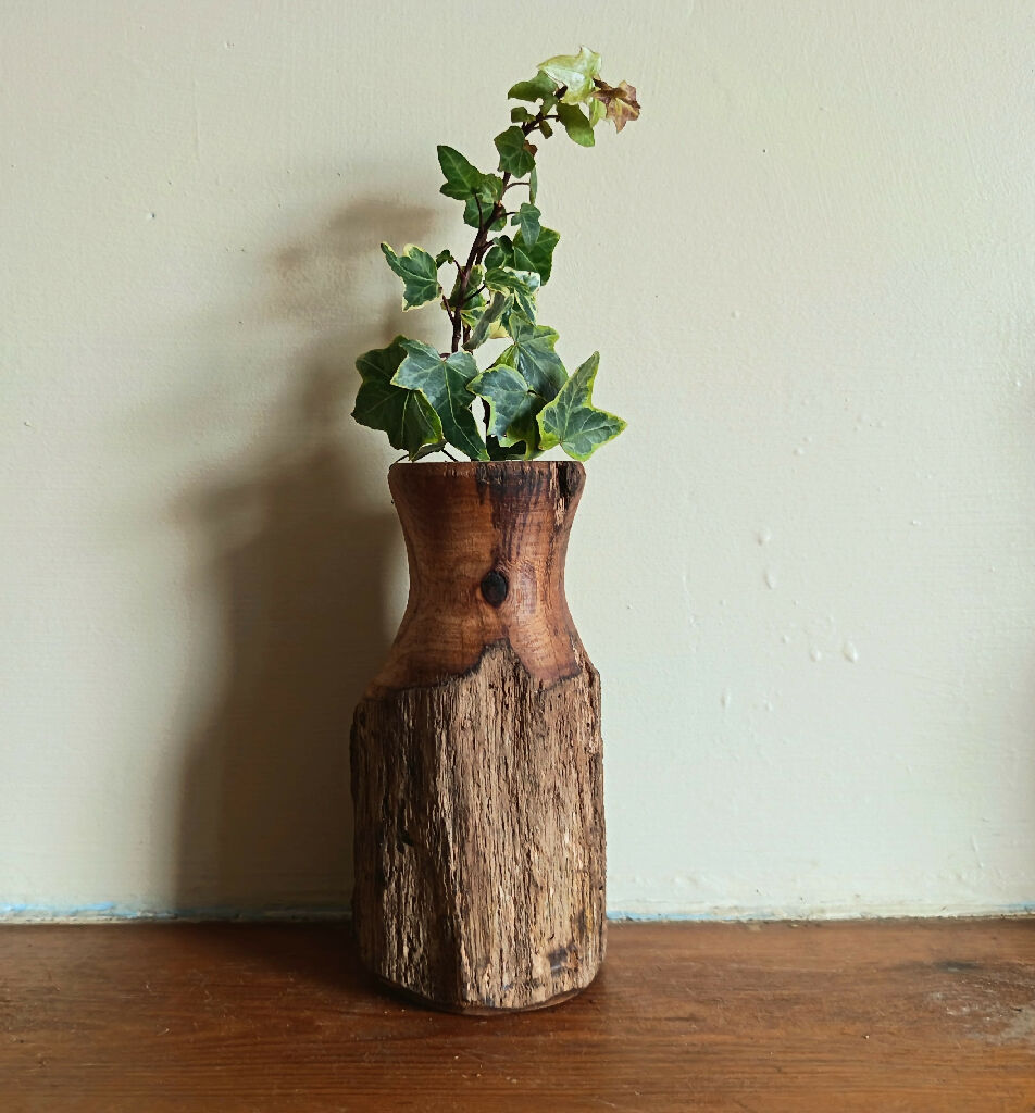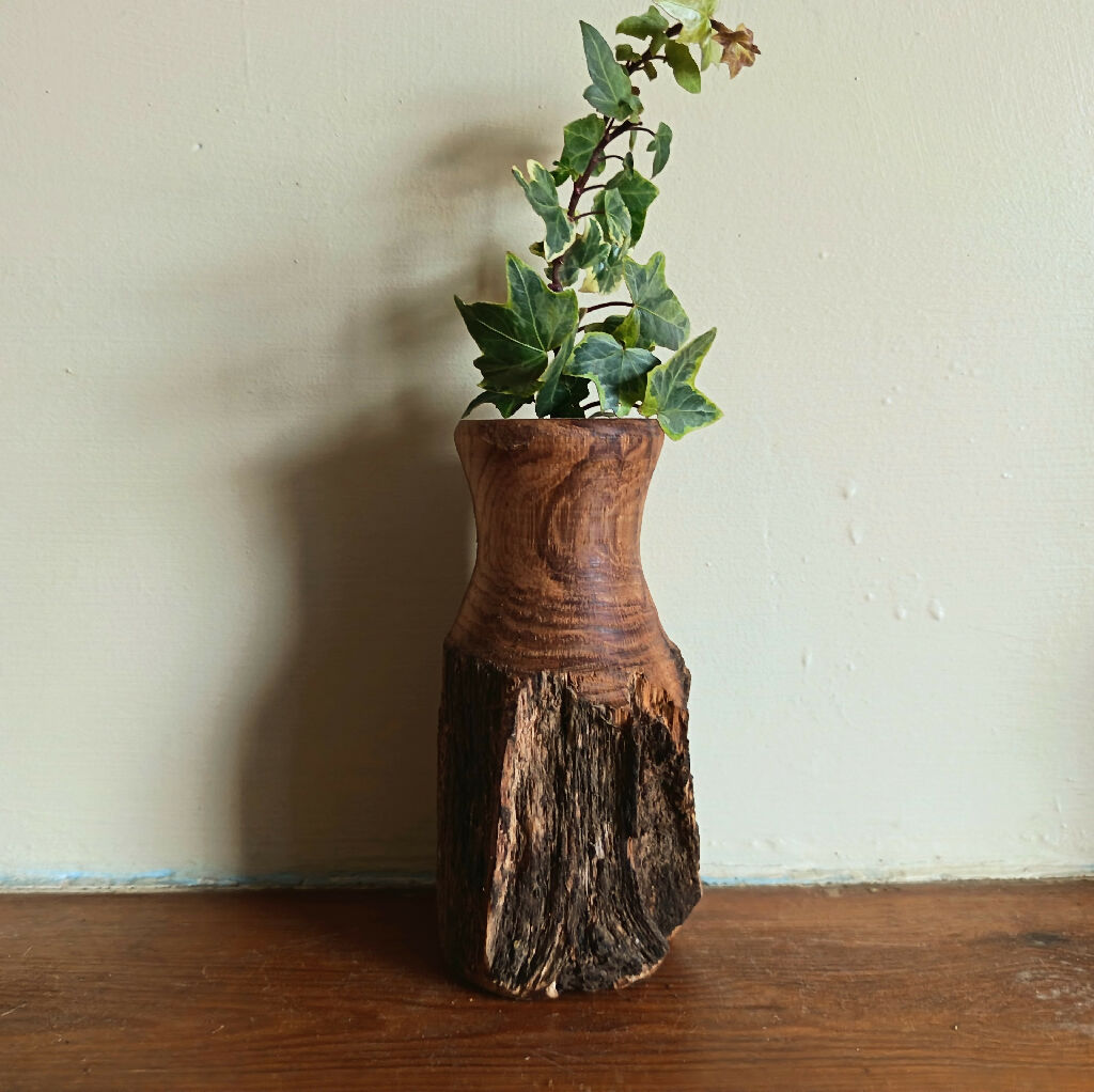 This turned bud vase is made from beautiful staghorn oak from my woodland. This is only found on really old oak trees and is wonderfully gnarly and hard. It has a test tube in so you can keep your flowers fresh, but looks equally good with dried flowers or grasses. The perfect present for a gardener or tree lover!