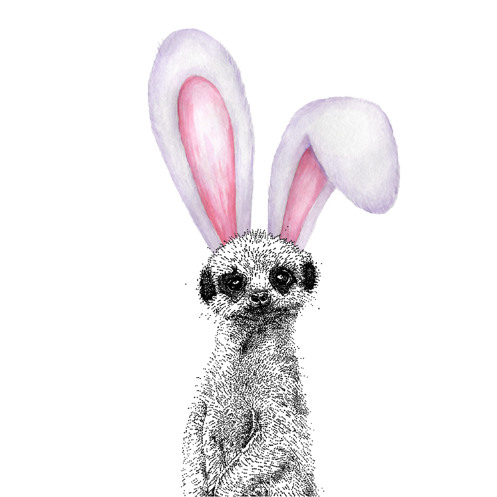 This playful card features my original highland meerkat illustration, finished with delicate hand-drawn dot detailing and topped with soft watercolour bunny ears for a sweet spring twist.