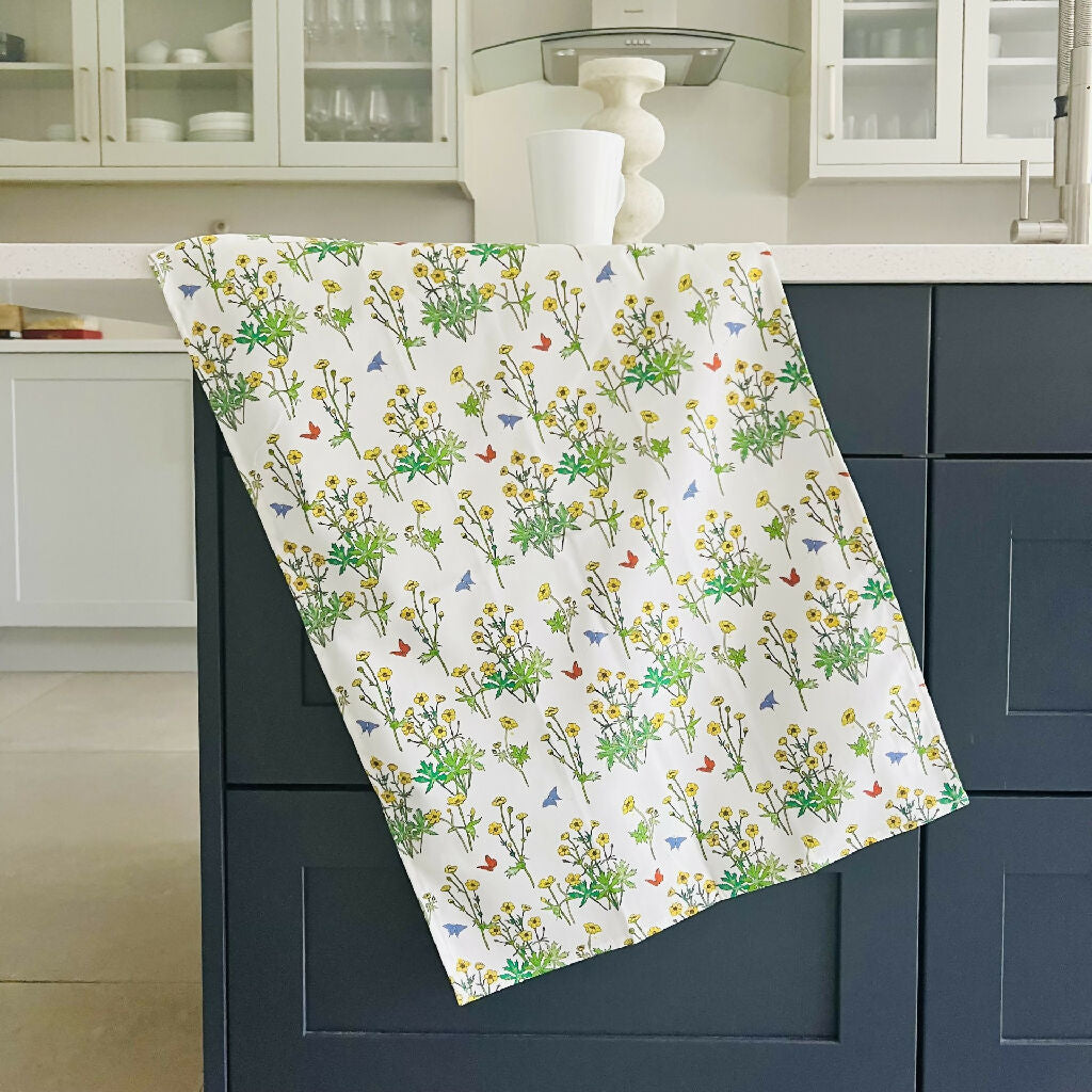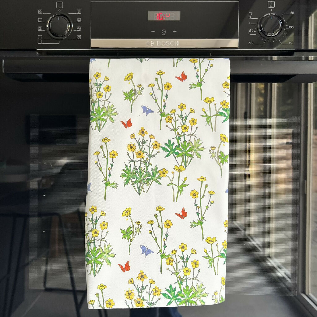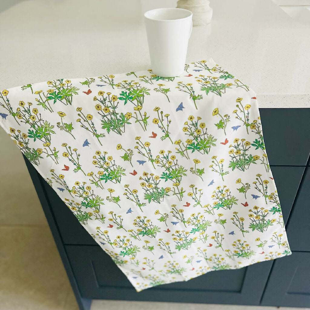 A beautiful organic cotton tea towel featuring Lottie’s hand drawn 'Buttercups' design.