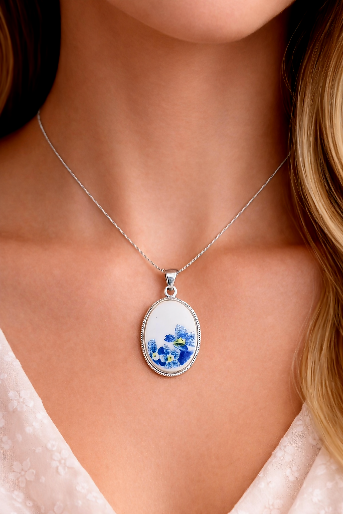 Hand crafted by Trisha Wood in Somerset, UK, this sterling silver pendant features reclaimed china with a pretty blue hand painted forget me not pattern. A sustainable, one-of-a-kind piece of timeless charm makes a lovely china anniversary gift
