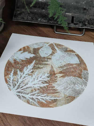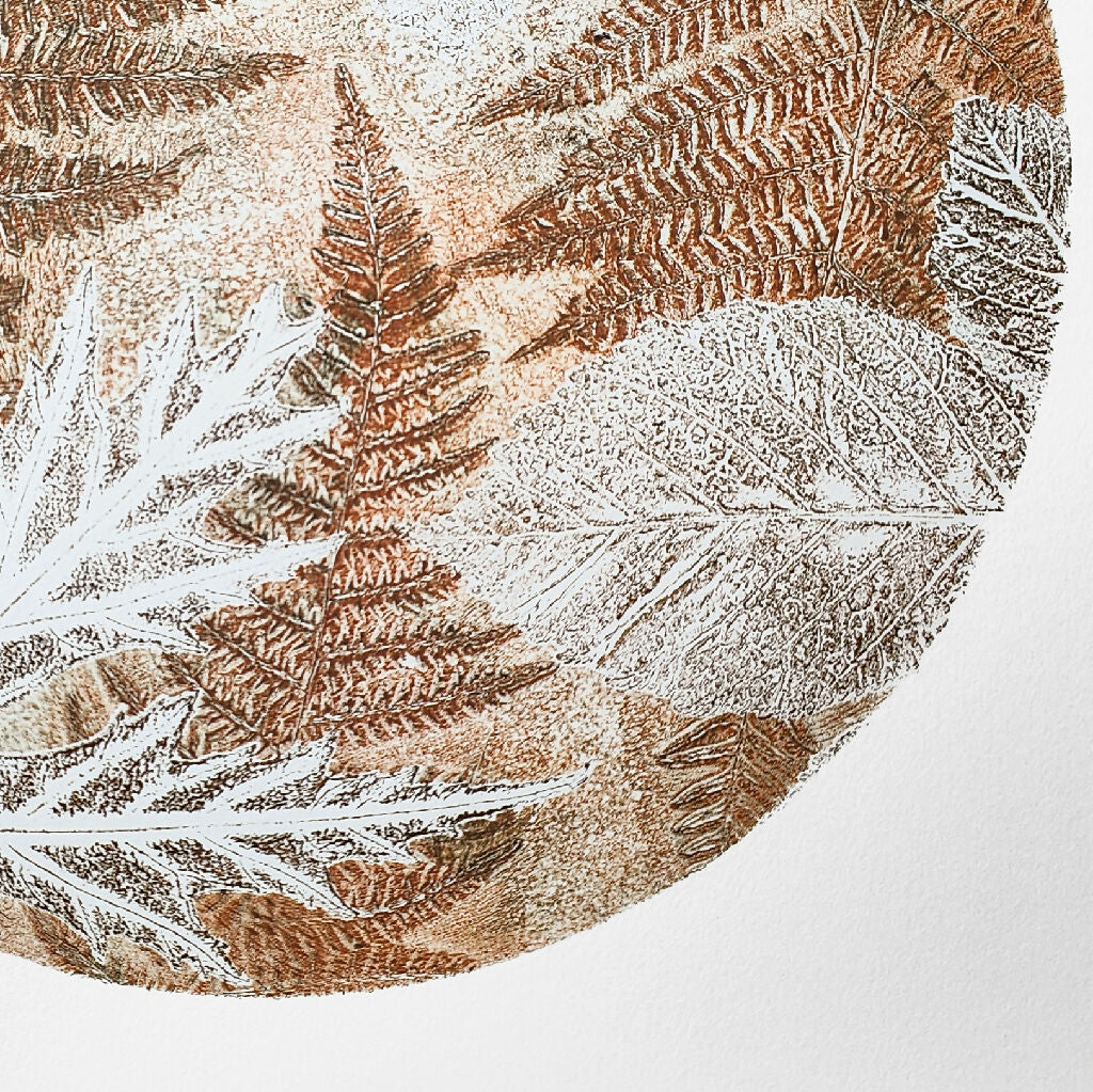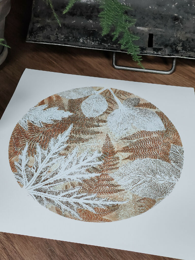 This item is a professional Giclee Fine Art print of the original gelli print artwork printed on high quality Innova smooth cotton archival paper. This gelli print consists of two layers using a circular template and hand mixed sunburnt orang hues in acrylic paint, transferring the intricate shapes and details of the foraged leaves.
