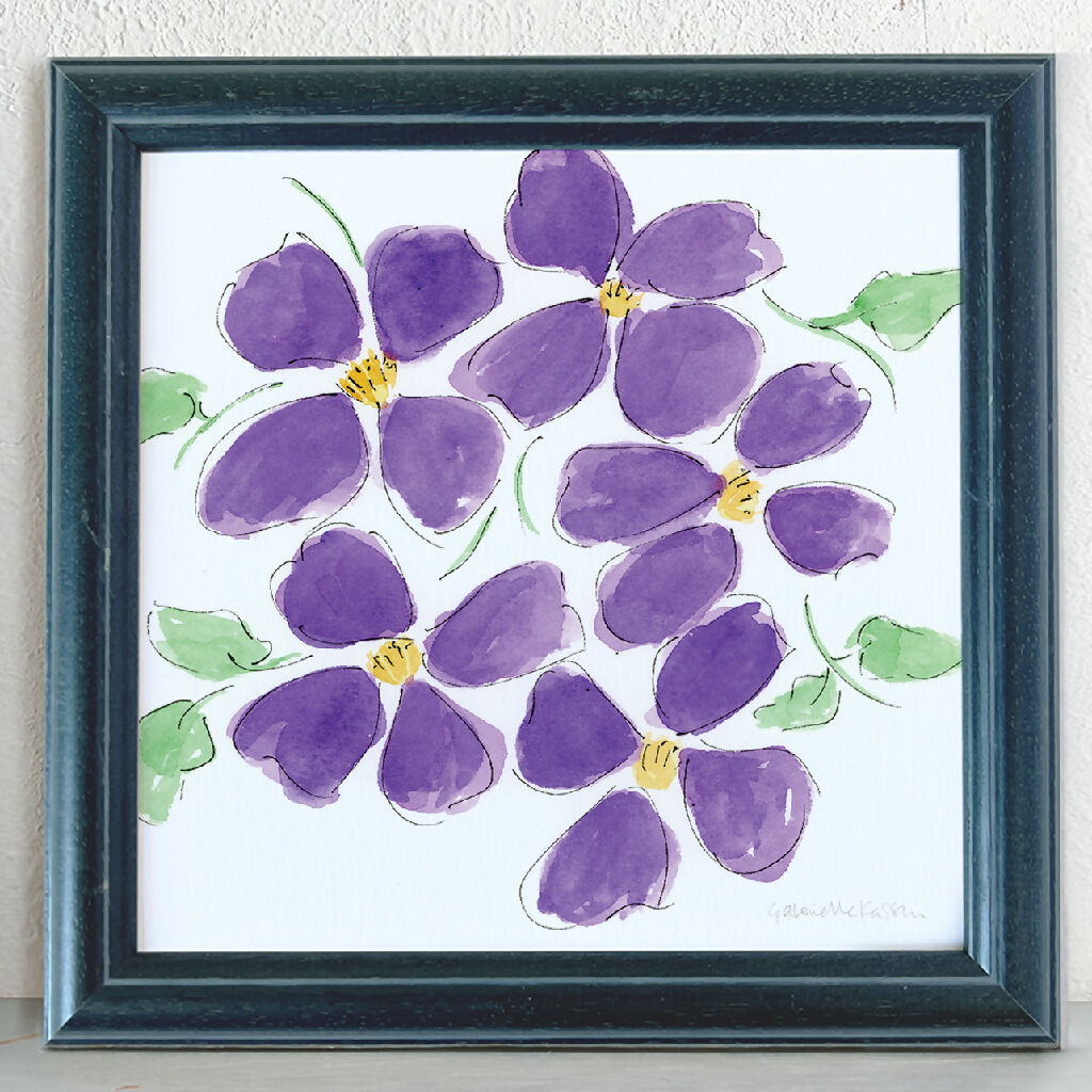 The traditional vintage frame is a blue coloured wood very similar to Farrow and Ball's Hague Blue. The frame is in good vintage condition with new glass.
