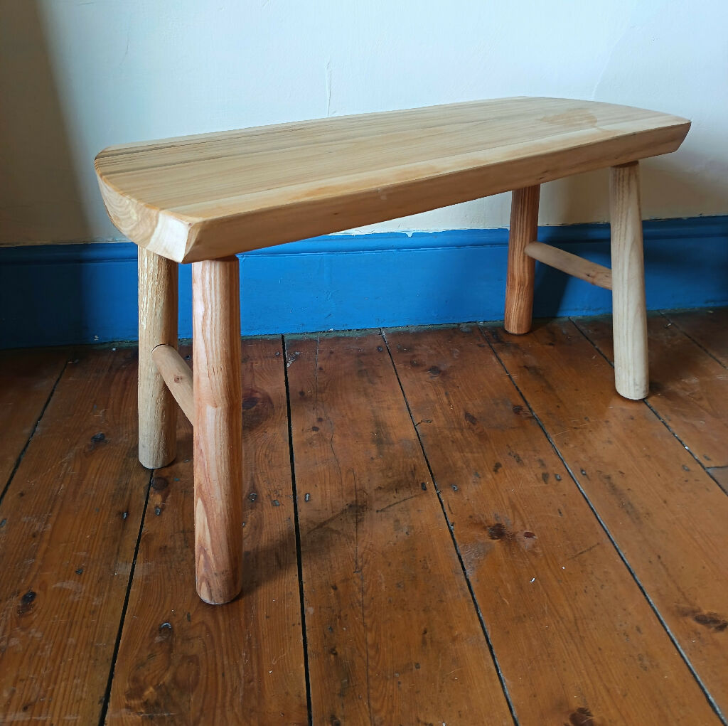 This coffee table is handmade from beautiful cherry wood. Cherry wood has a lovely warm colour and gorgeous grain. It has turned ash legs and hazel stretchers. It has felt pads on its feet too. The top is finished with hard-wearing wax oil. The perfect size for residing next to a sofa, or it could used as a bench.