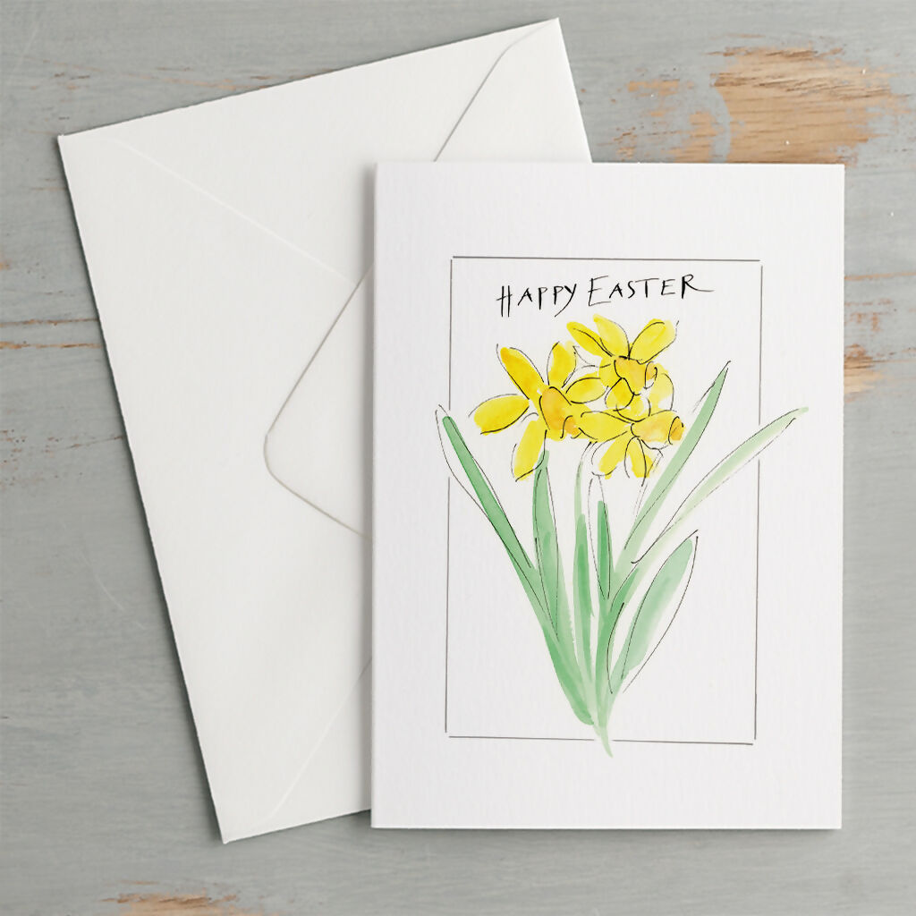 The bunch of Daffodils Easter card illustration was originally hand drawn with a dip pen, ink and painted in a loose watercolour style. The calligraphy was drawn with a dip pen.
