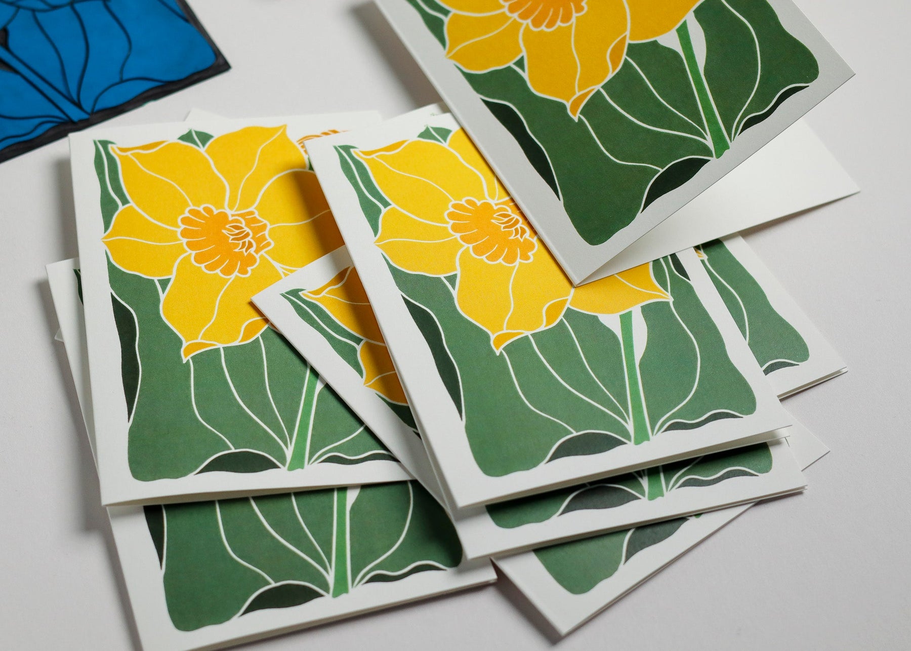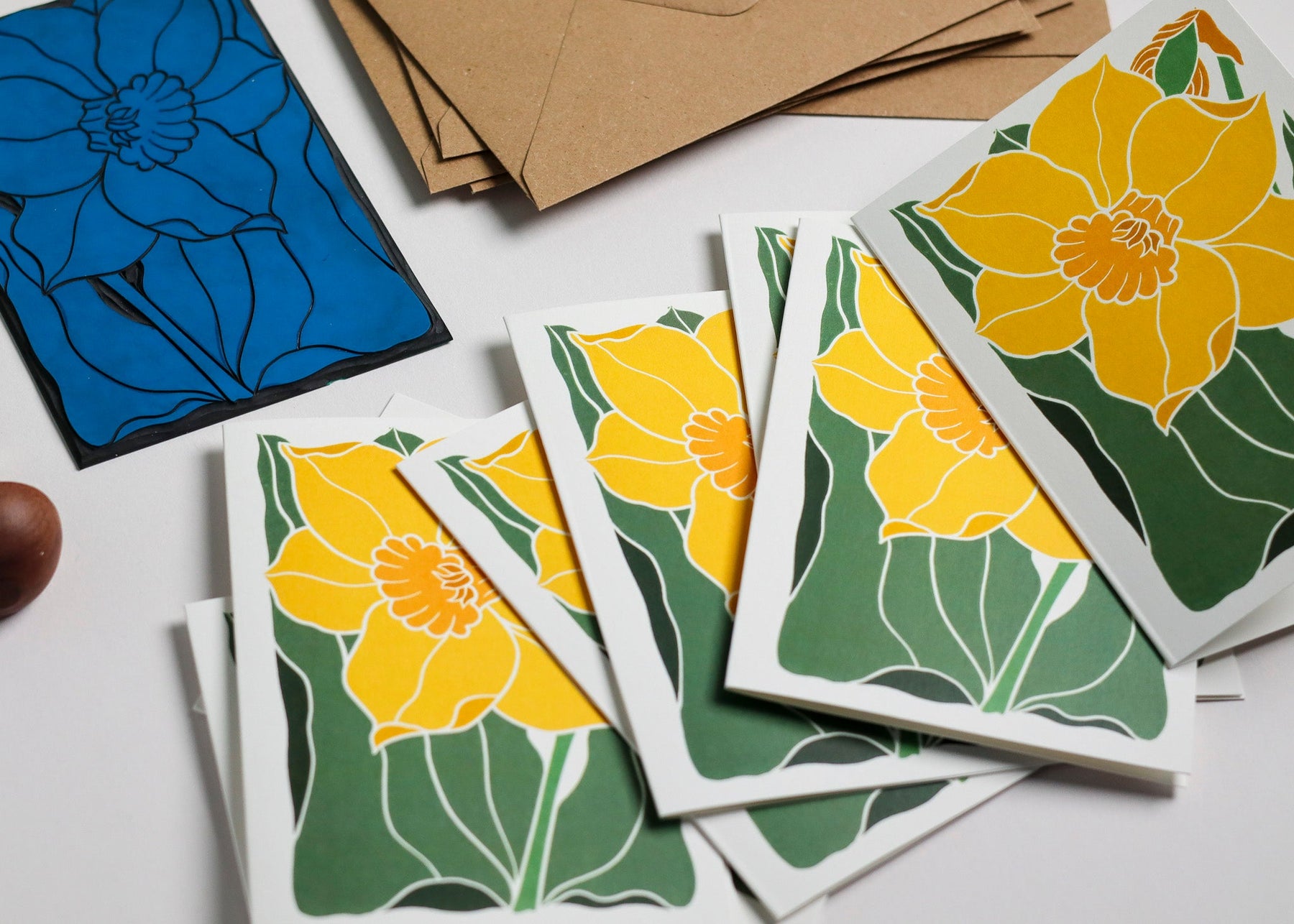 Spring's cheerful messenger, captured mid-dance. That iconic golden trumpet and swept-back petals - the daffodil we all know and love, the flower that means winter is finally over. This linocut portrays a single daffodil in full glory, stem curved as if caught by a spring breeze. Bright yellow petals and trumpet in classic daffodil gold - pure sunshine carved into lino.