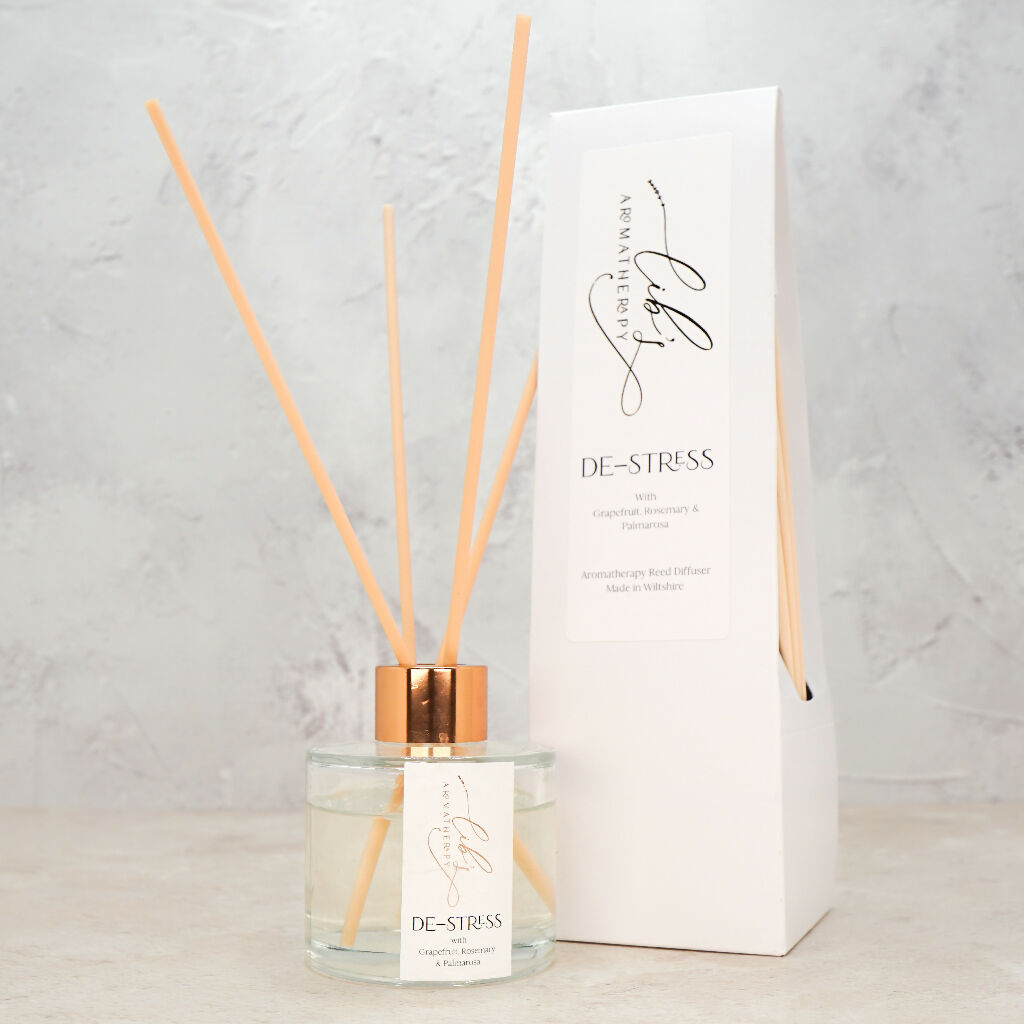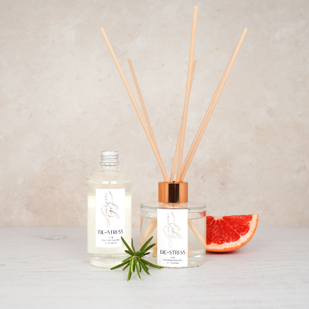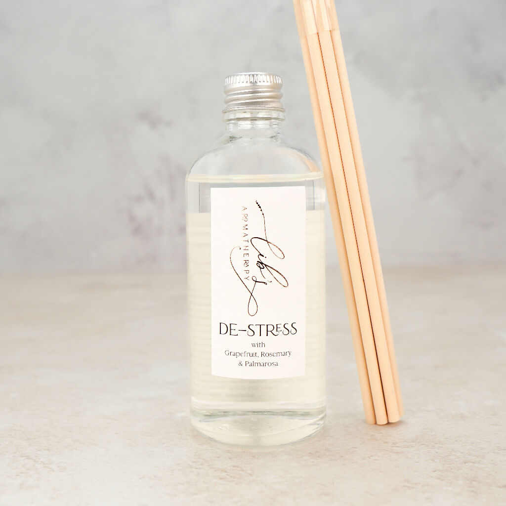 Handmade with pure essential oils, the De-Stress Essential Oil Reed Diffuser fills your home with a fresh, herbal aroma of grapefruit, rosemary and palmarosa. This natural blend restores clarity and calm, creating a peaceful, balanced environment.