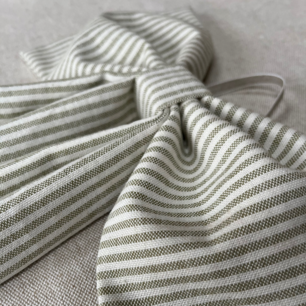 A beautiful decorative bow made in Olive Green Piping Stripe cotton by Susie Watson Designs. Available in two sizes.