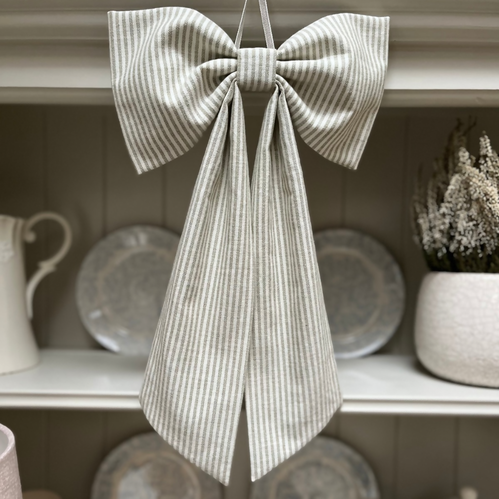 The stripe fabric is on the front and back of the bow and there is a linen ribbon loop so the bow can be hung from hooks or handles around the home.