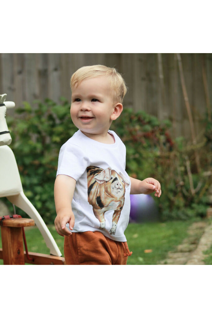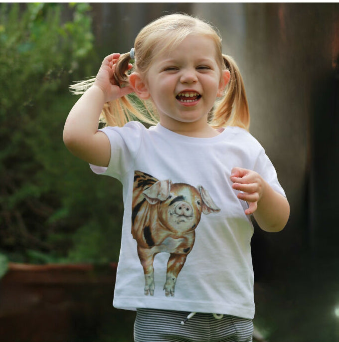My fun children's T Shirt features the cutest Oxford Sandy and Black piglet.