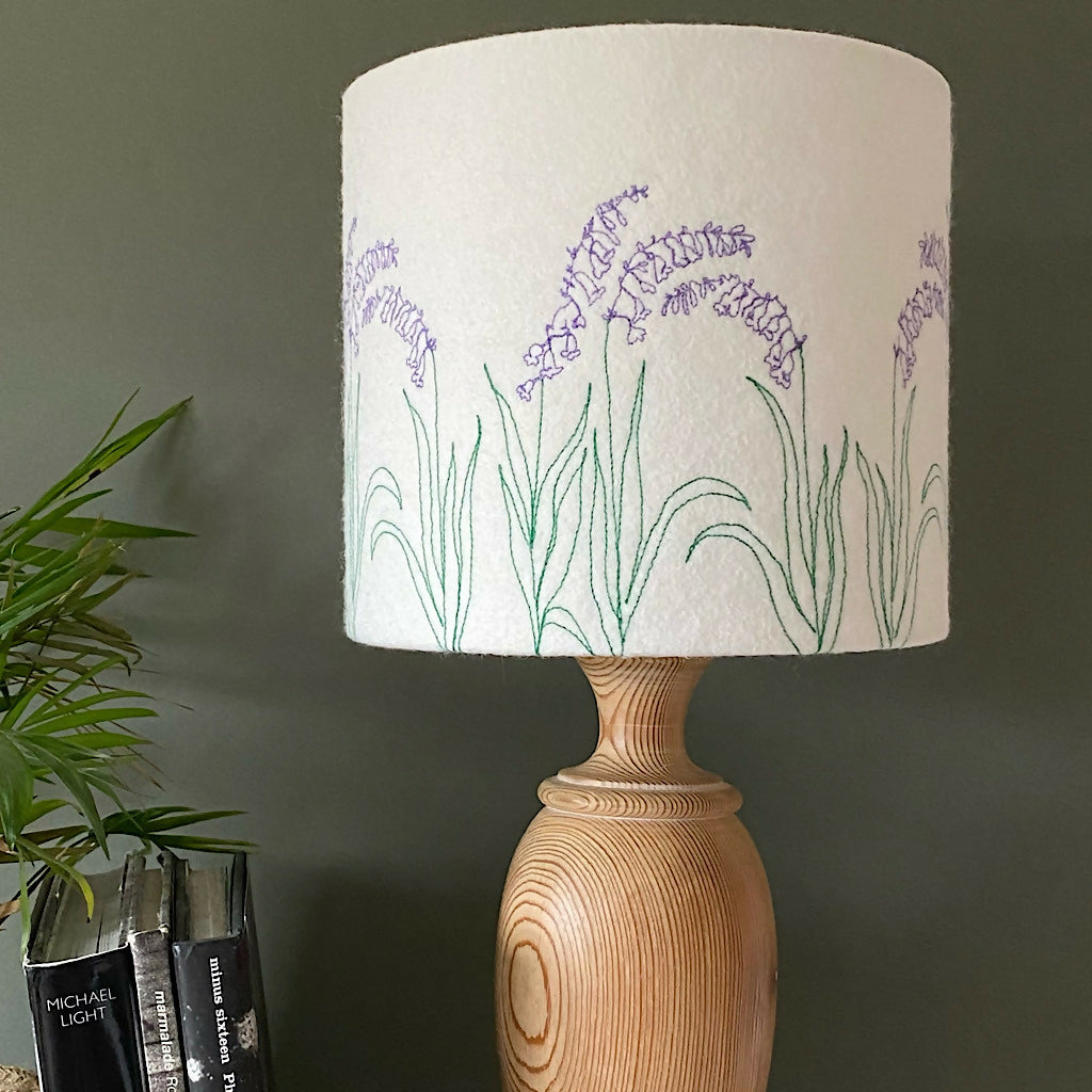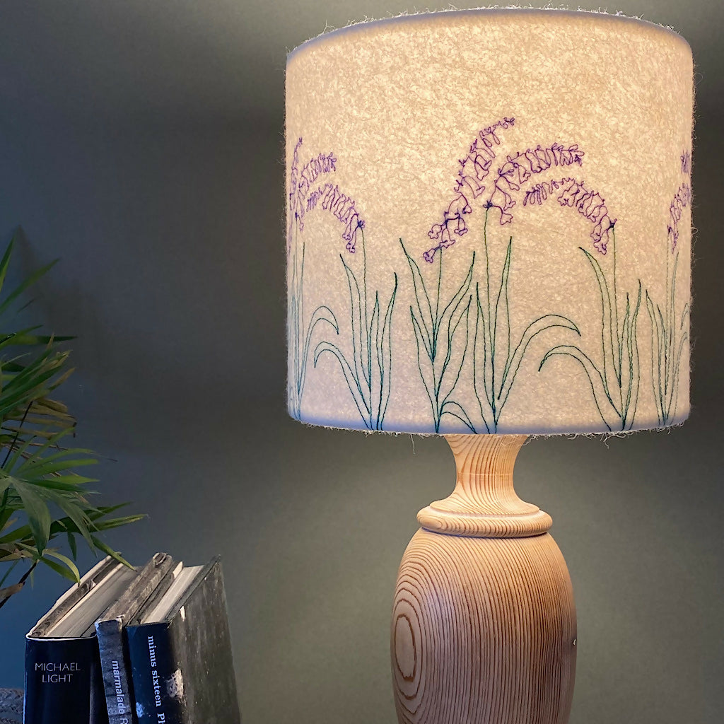 A freehand machine embroidered bluebell flower lampshade.