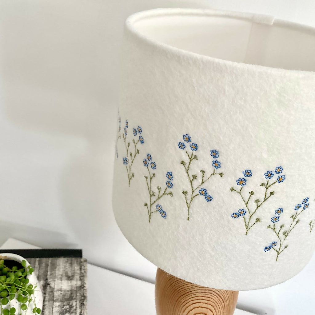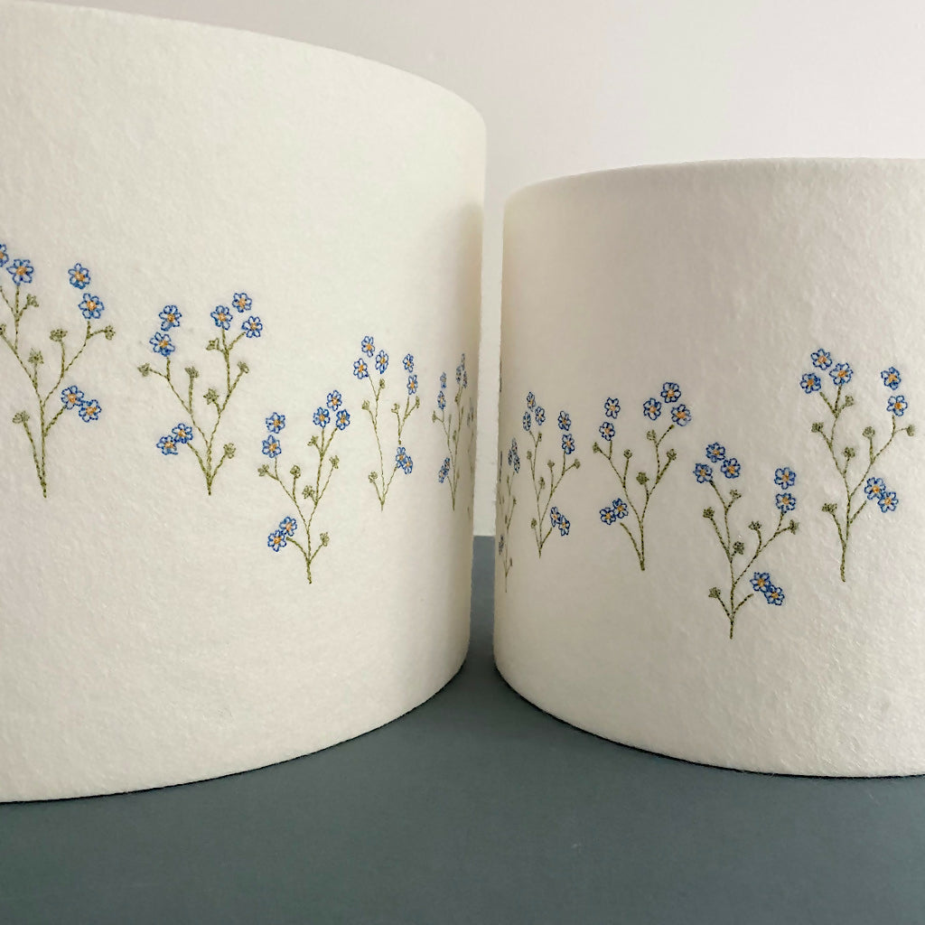 A neutral colour felt background using blue, yellow and green threads to stitch the design.