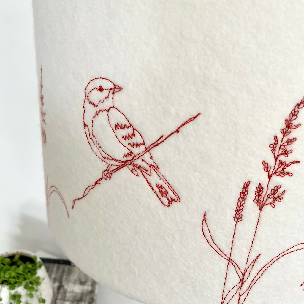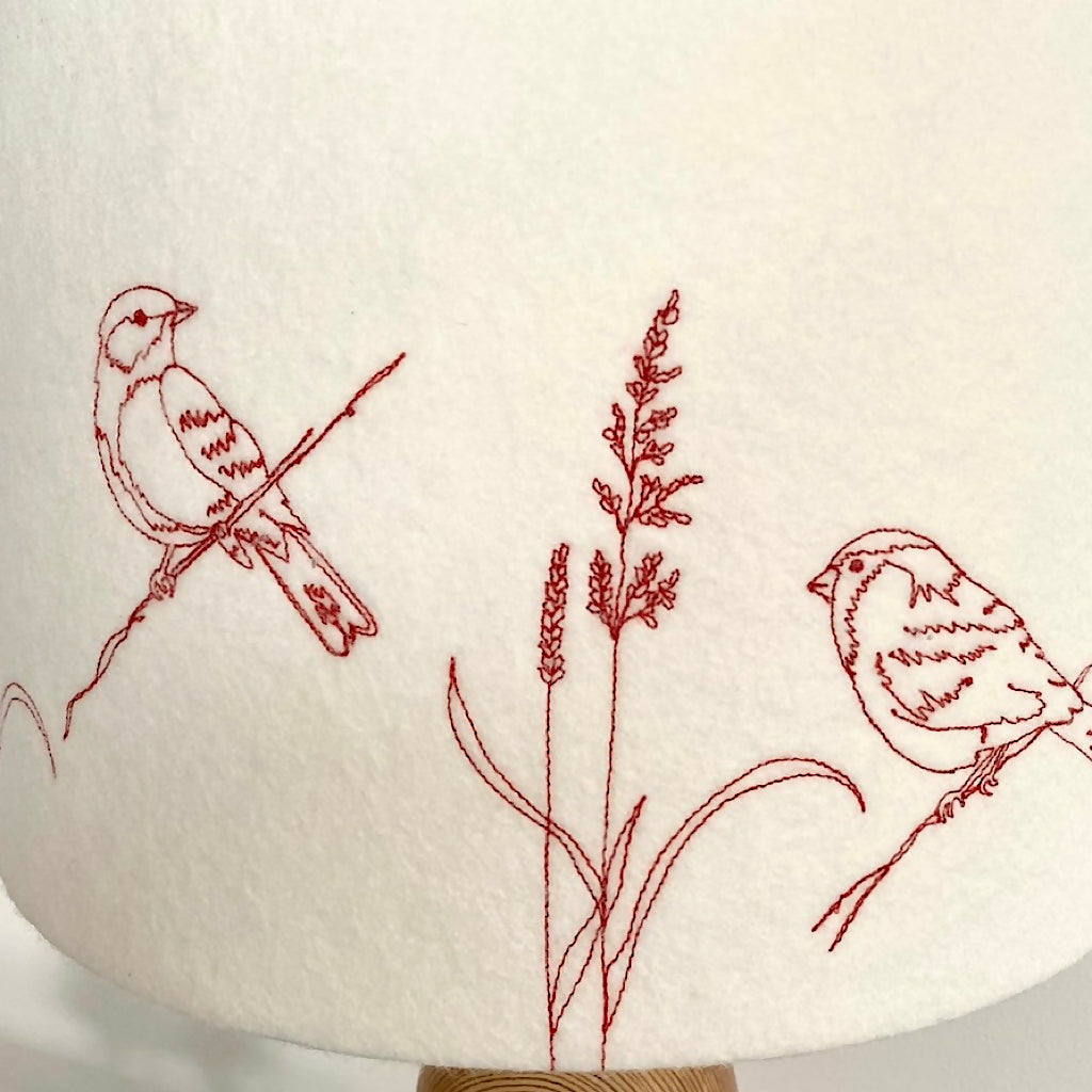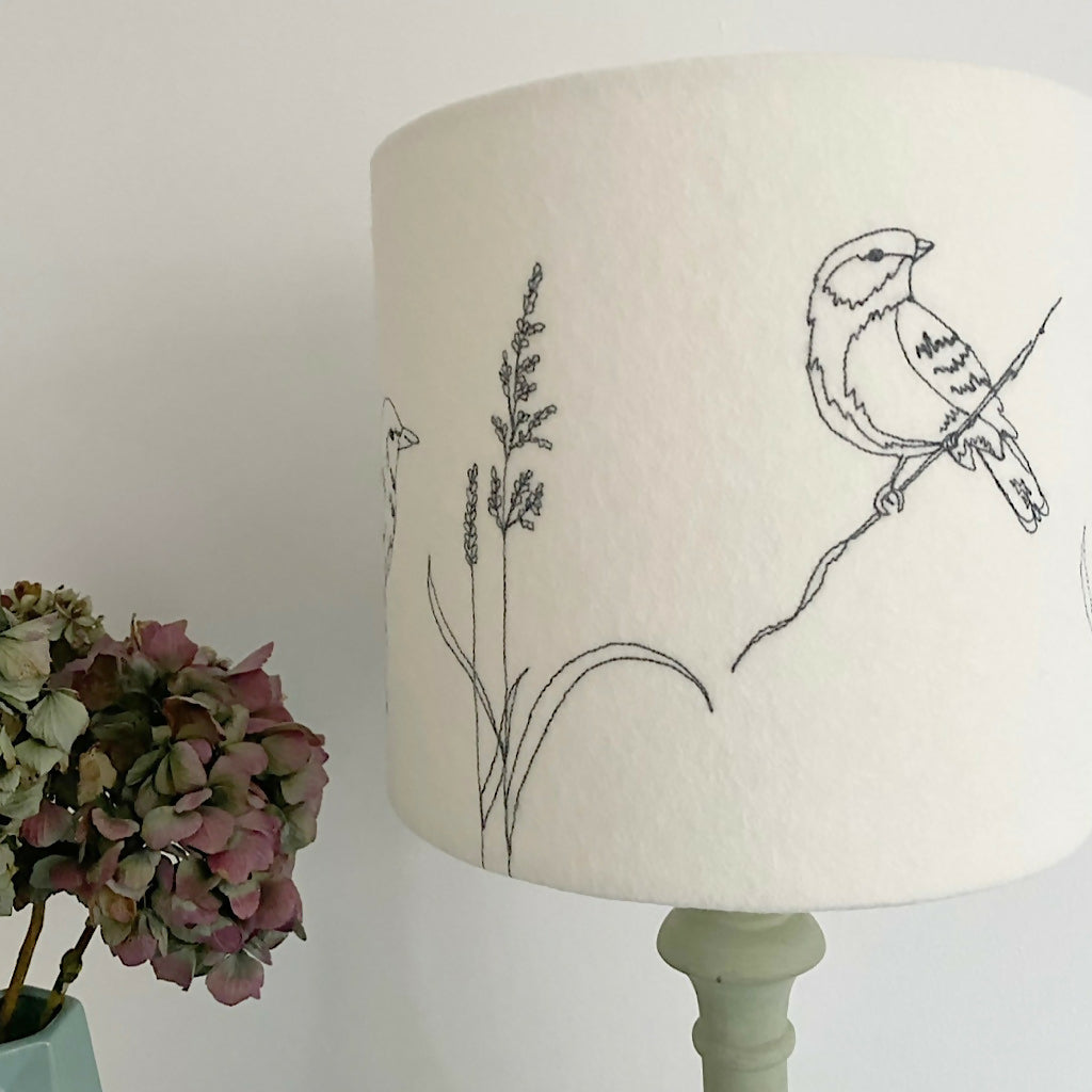 A machine embroidered Garden Bird and Grass stitched lampshade. A neutral colour felt background using the colour stitch of your choice threads to stitch the birds and grass around the shade.