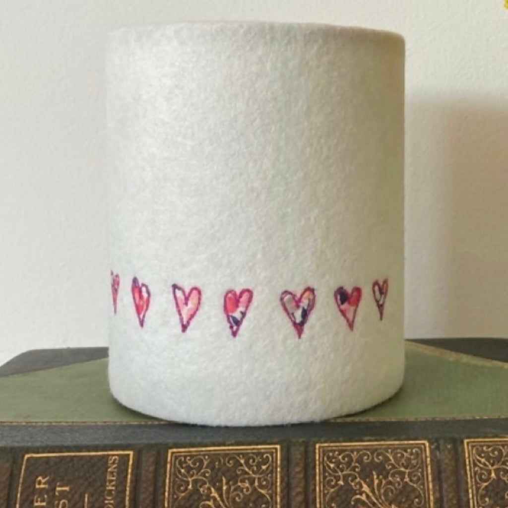 A machine embroidered Heart design on a lantern. A neutral felt background using the Liberty Print fabric of your choice to appliqué seven hearts on the lantern.